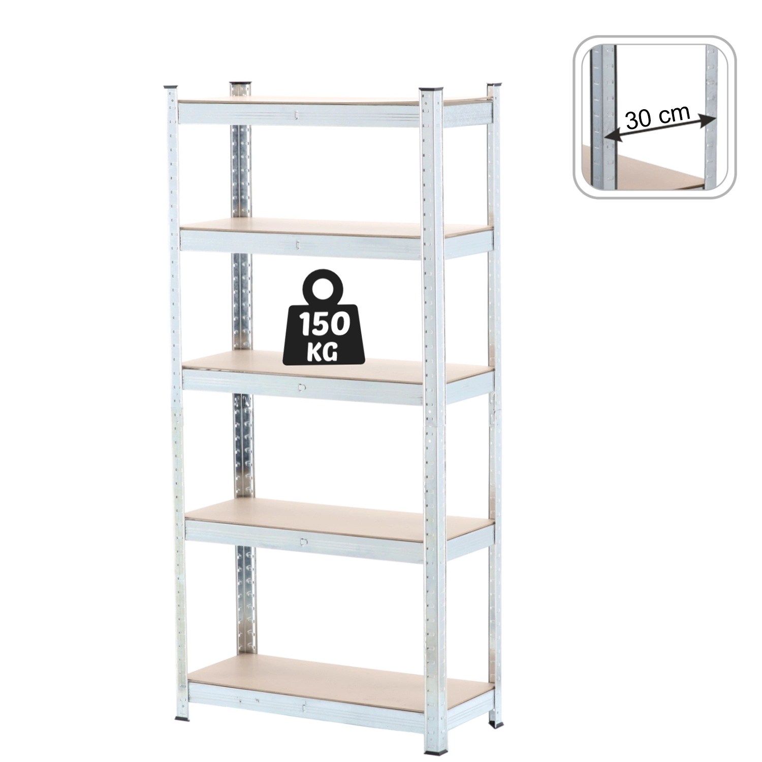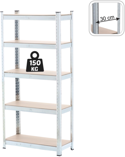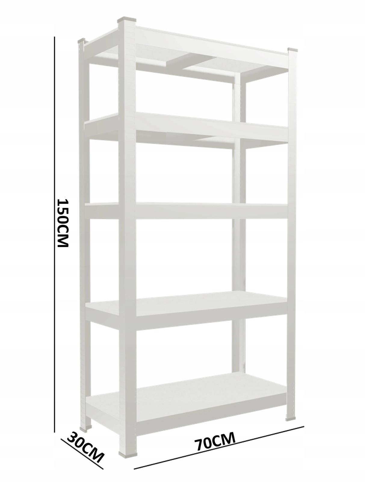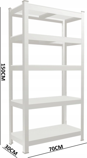 Praktyczny 5‑poziomowy metalowy regał zaprojektowano z myślą o maksymalnej stabilności i długiej żywotności. Maszyna stalowa rama w połączeniu z wytrzymałymi półkami MDF gwarantuje niezawodne przechowywanie nawet cięższych przedmiotów, przy czym każda półka wytrzymuje do 150 kg przy równomiernym rozłożeniu obciążenia. Smukła głębokość 30 cm oszczędza miejsce, a jednocześnie zapewnia wystarczającą powierzchnię użytkową.