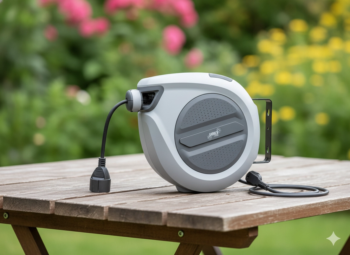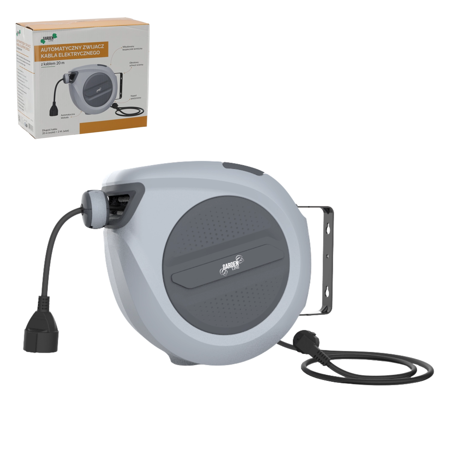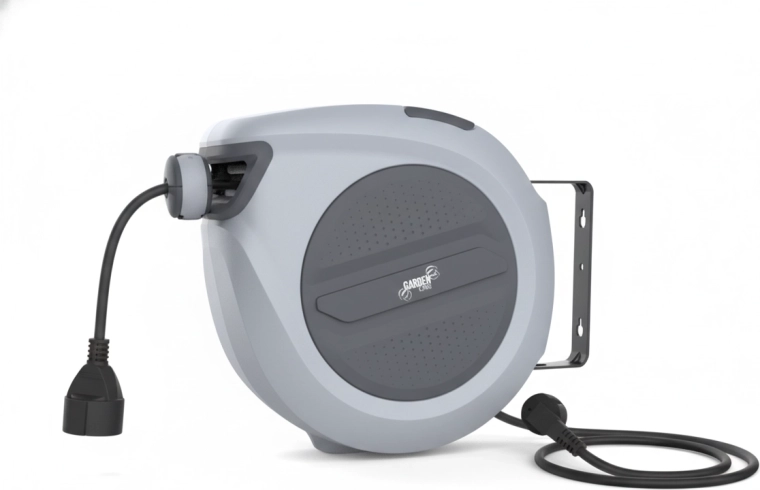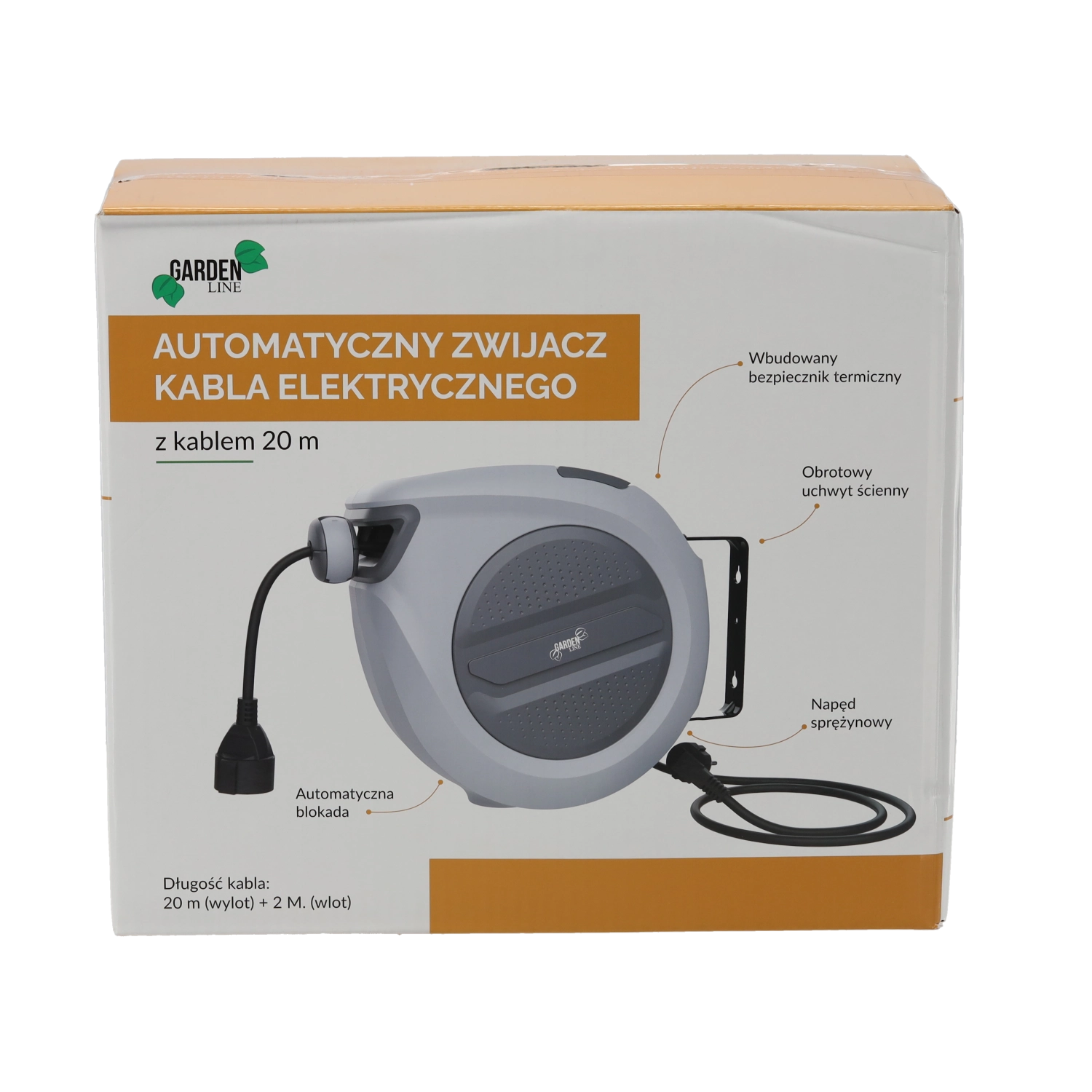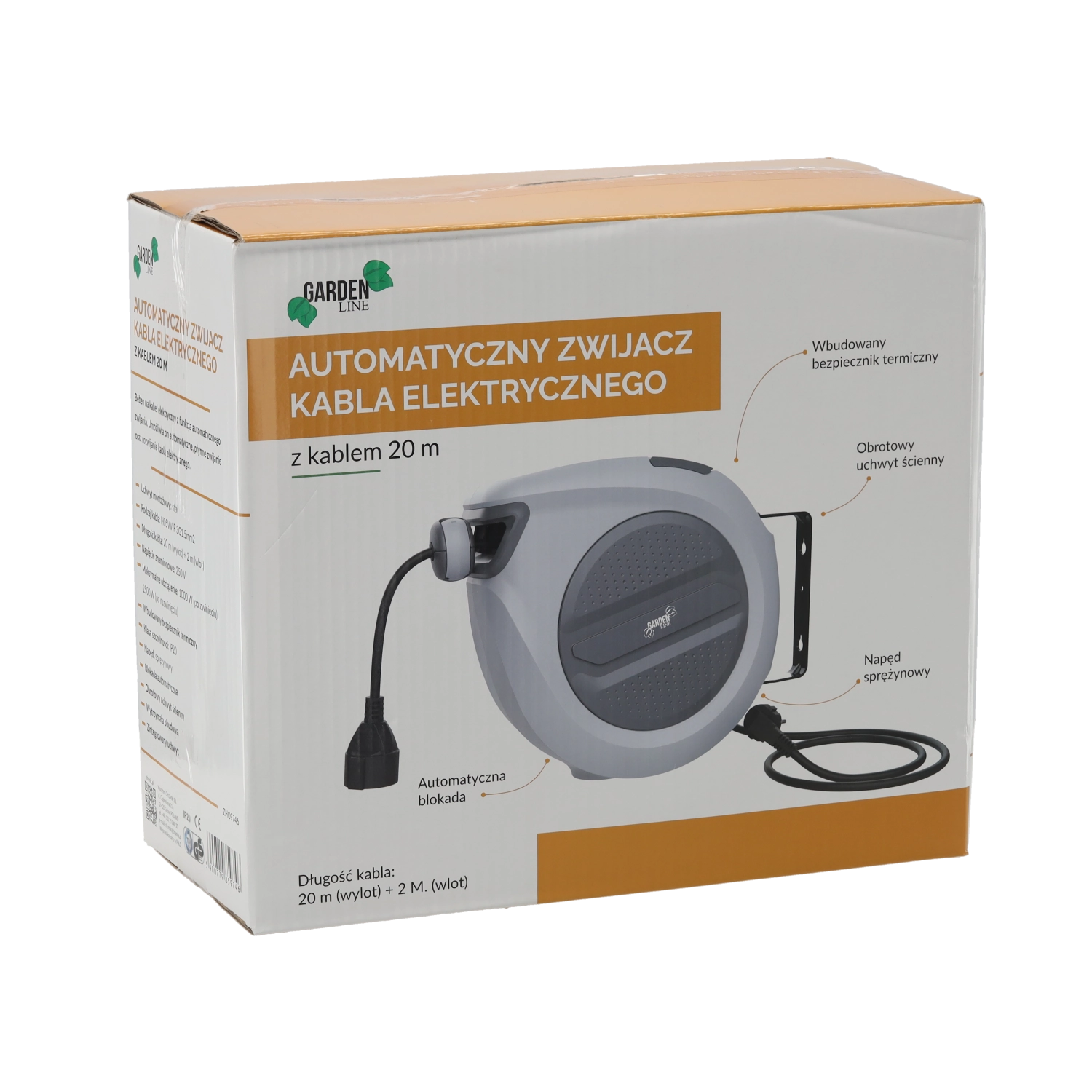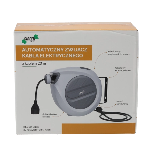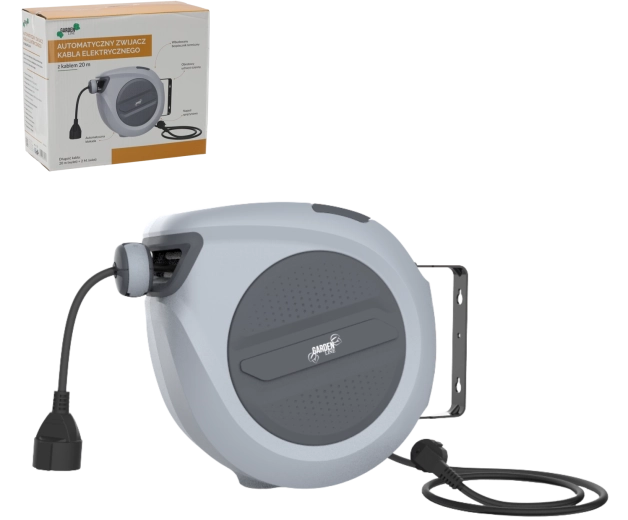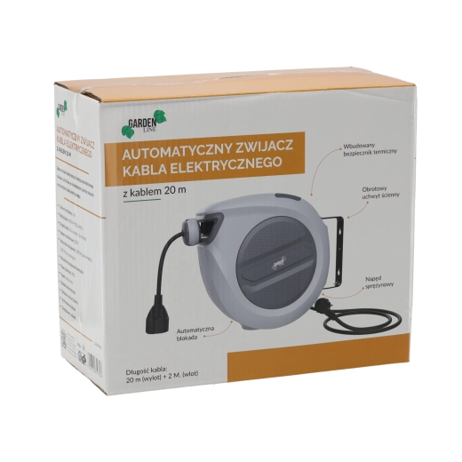 Automatyczna zwijarka przewodu elektrycznego o długości 20 m ułatwi codzienną pracę. Kabel wysuwa się płynnie i dzięki blokadzie utrzymuje wymaganą długość; po zwolnieniu dzięki mechanizmowi sprężynowemu bezpiecznie i schludnie wraca z powrotem. Zintegrowany termiczny element zabezpieczający chroni zwijarkę oraz podłączone urządzenia.