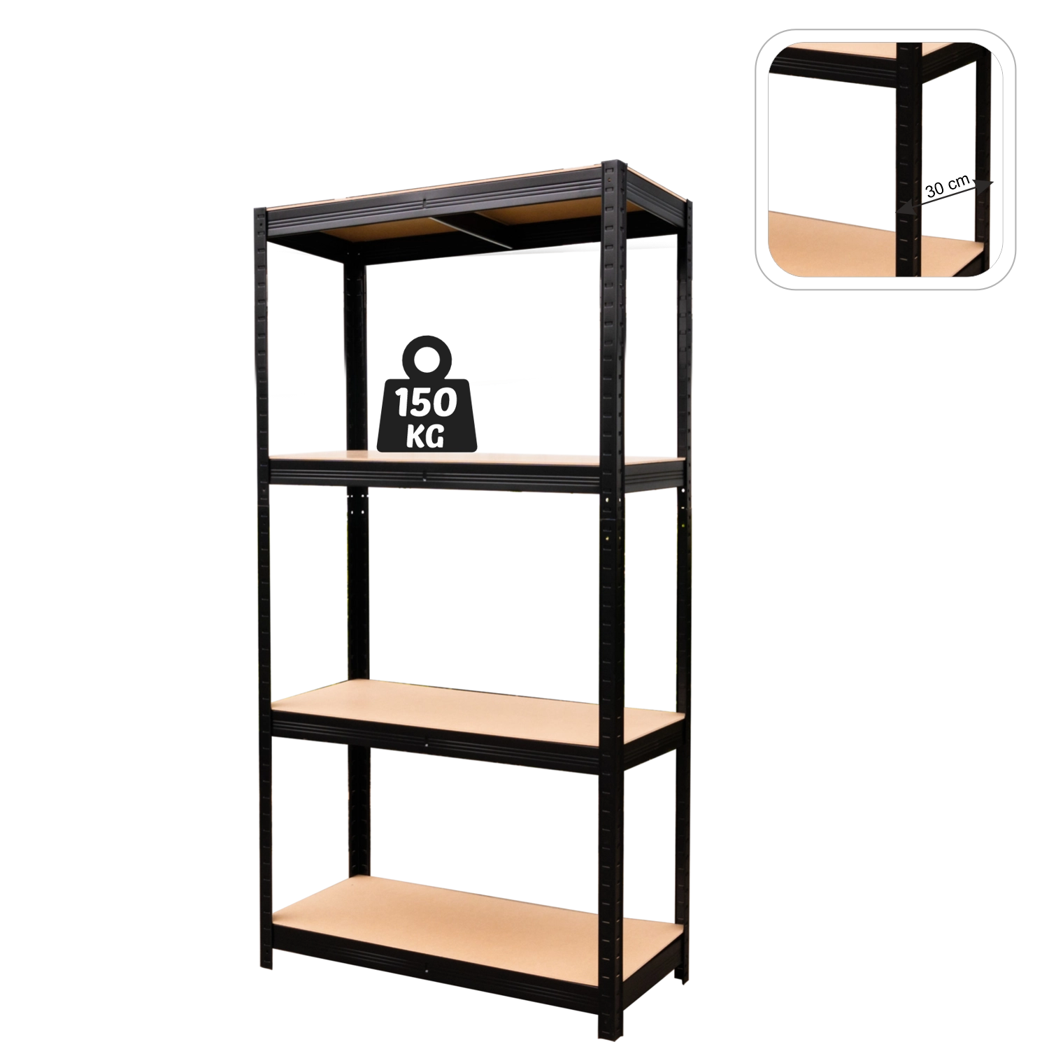 Każda półka wytrzymuje do 150 kg (przy równomiernym rozłożeniu obciążenia). Metalowa rama, wzmocnienia pod półkami i płyty MDF zapewniają bezpieczne przechowywanie cięższych przedmiotów.