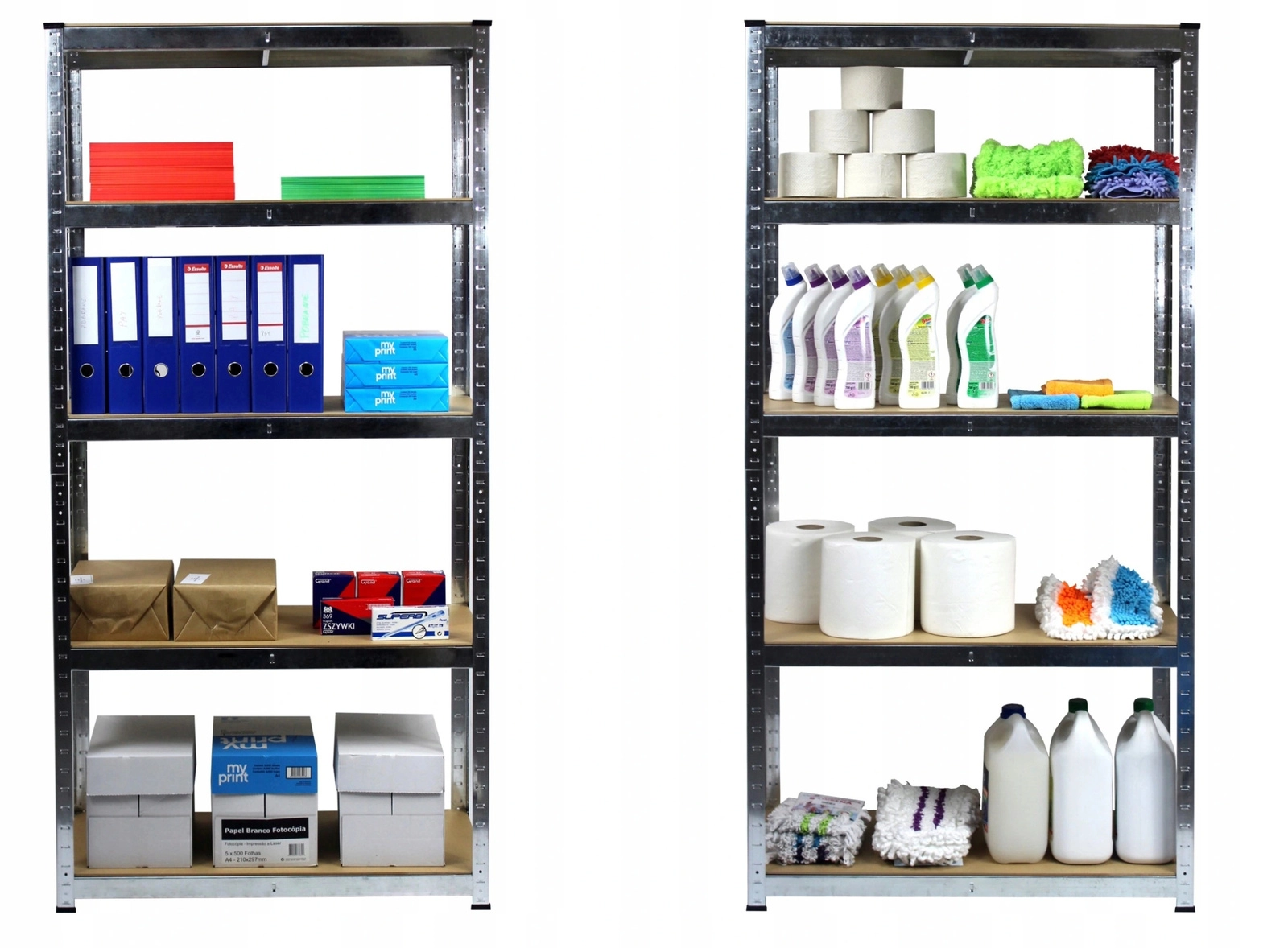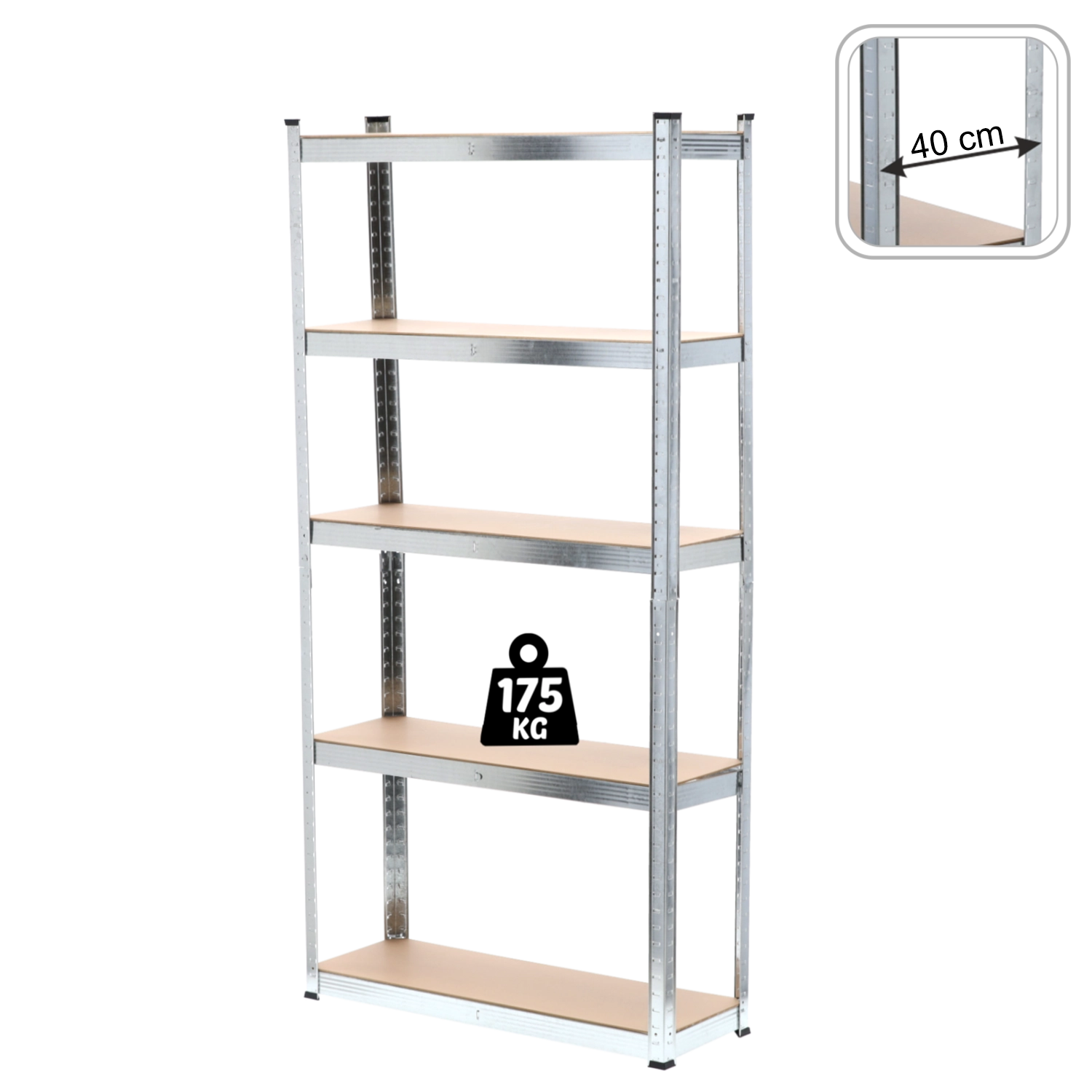 Solidny regał z pięcioma półkami łączy ocynkowane stalowe profile i odporne płyty MDF dla długiej żywotności oraz bezpiecznego przechowywania narzędzi, pudeł i zapasów. Regulowana wysokość półek umożliwia efektywne wykorzystanie przestrzeni pionowej i dopasowanie regału do przedmiotów o różnych rozmiarach. Wzmocnienia pod każdą półką zwiększają sztywność konstrukcji i gwarantują stabilność nawet przy większym obciążeniu.