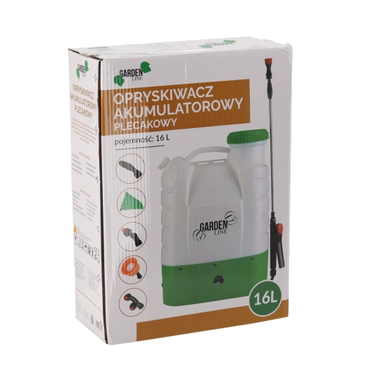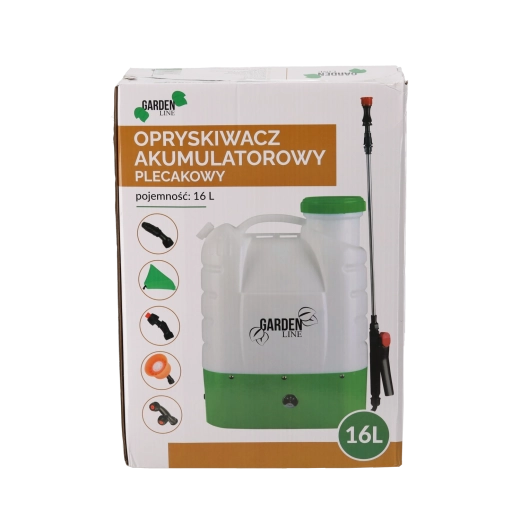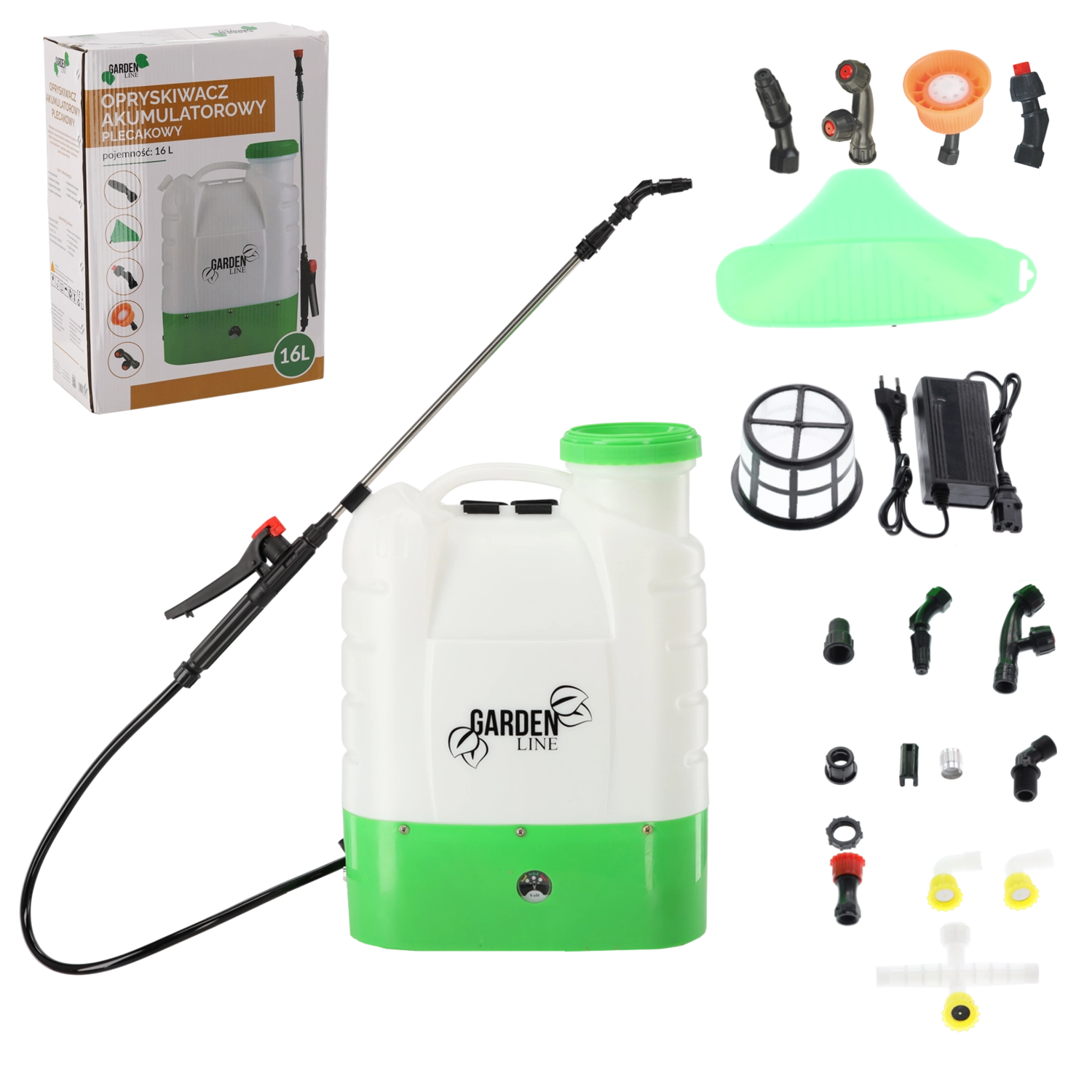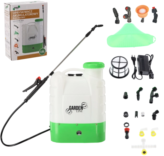 W komplecie bogaty zestaw akcesoriów: kilka typów dysz do różnych rodzajów oprysku, metalowa/kompozytowa lanca opryskowa z pistoletem, wąż, ładowarka oraz sitko filtrujące przeciw zanieczyszczeniom. Zintegrowany wskaźnik naładowania, bezpiecznik i prosty panel gwarantują bezpieczną i intuicyjną obsługę.
