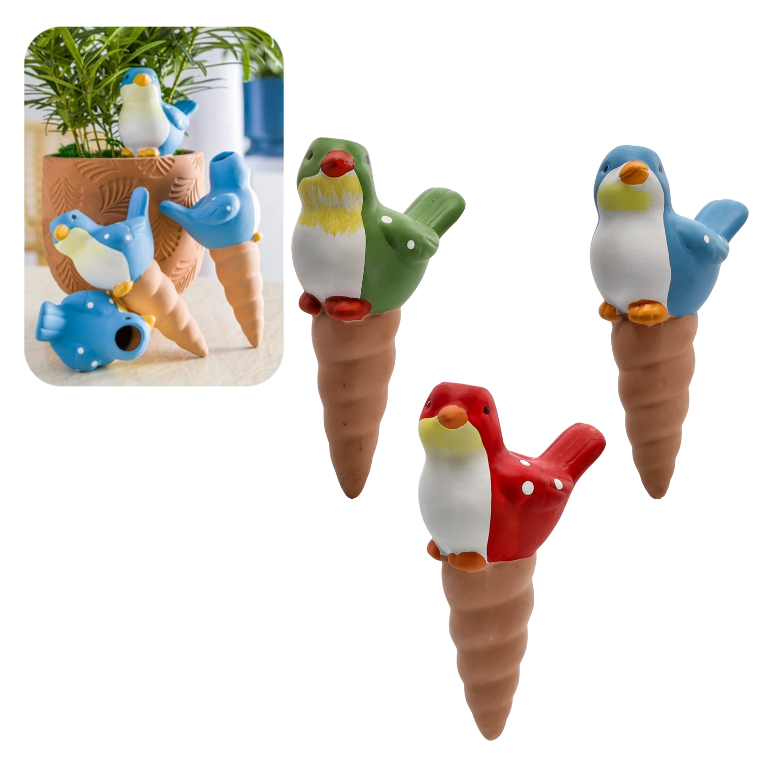 Koniec z więdnięciem liści po weekendzie poza domem. Ceramiczny stożek nawadniający w kształcie ptaszka zapewnia równomierne i stopniowe podlewanie bezpośrednio do korzeni. Jest perfekcyjny do kwiatów w domu, na tarasie oraz do wiszących donic. Dekoracyjny wygląd doda Twoim roślinom stylowego akcentu, a funkcjonalne ceramiczne korpus zapewni stabilną wilgotność podłoża.