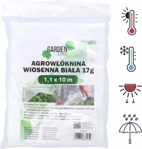 Materiał o niskiej gramaturze 17 g/m² jest lekki i delikatny dla roślin – nie łamie ich i nie deformuje. Stabilizacja UV wydłuża żywotność i odporność na promieniowanie słoneczne. Agrowłókninę łatwo przymocujesz kołkami, kamieniami lub ziemią i w każdej chwili uniesiesz do podlewania czy zbioru.