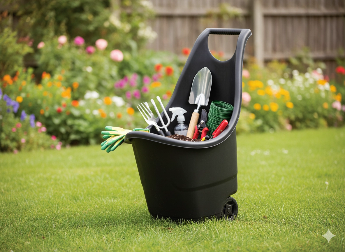 Wytrzymałe tworzywo odporne jest na deszcz i słońce, dzięki czemu wózek zachowa swój wygląd i funkcjonalność przez cały sezon. Dzięki pionowej konstrukcji i zaokrąglonemu rantowi łatwo się nim manewruje i nie zajmuje dużo miejsca podczas przechowywania.