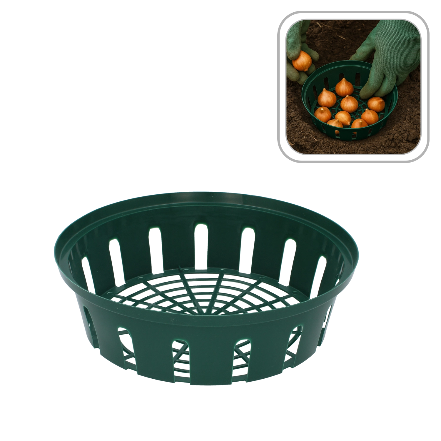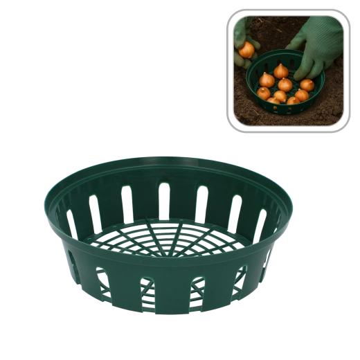 Kosz wykonano z wytrzymałego plastiku, który bez problemu znosi niekorzystne warunki atmosferyczne. Dzięki uniwersalnym wymiarom nadaje się do szerokiej gamy cebul – od tulipanów przez narcyzy po hiacynty – i doskonale sprawdza się przy wielokrotnym, sezonowym użytkowaniu.