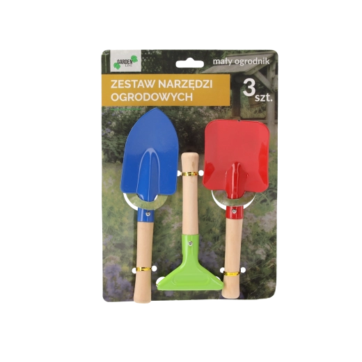 Praktyczny zestaw trzech ręcznych narzędzi do pielęgnacji rabat i donic. Zawiera kultywator, ostry sadzak oraz klasyczną łopatkę do łatwego sadzenia, przesadzania i spulchniania gleby.