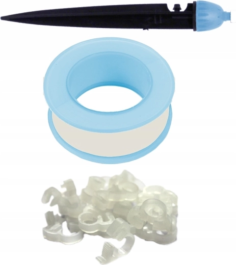 Kolec glebowy/kroplownik, taśma teflonowa oraz klipsy mocujące ułatwiają montaż i prowadzenie wężyków. Stabilne ułożenie minimalizuje ryzyko wycieku wody.
