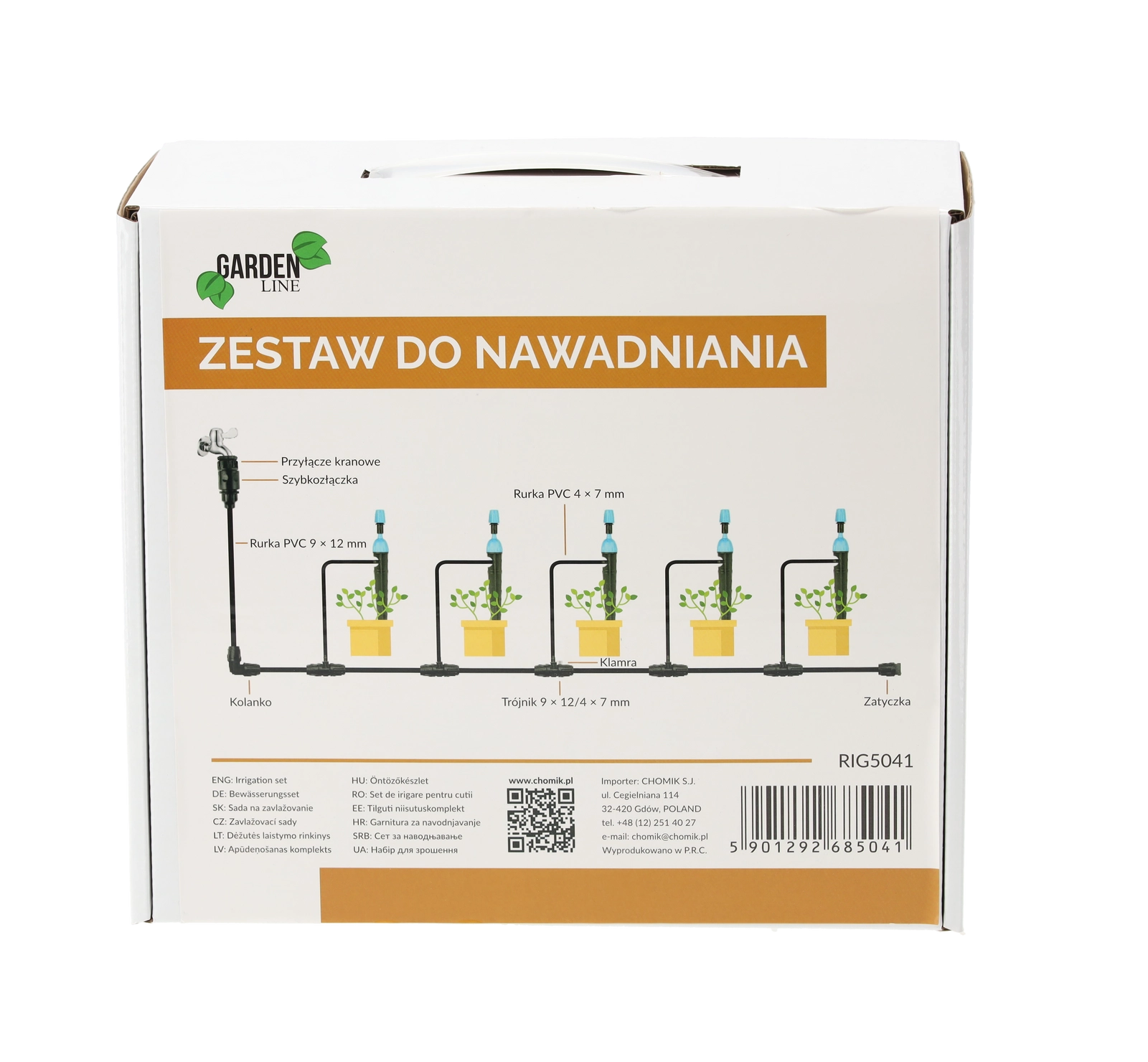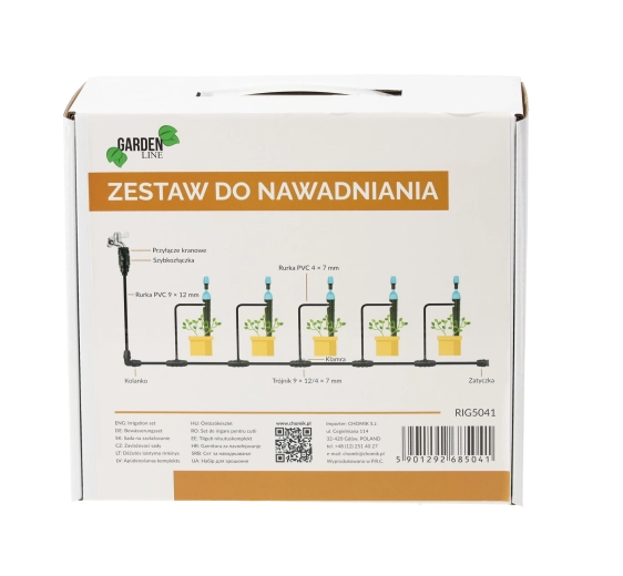 Ten uniwersalny zestaw nawadniania kroplowego zaprojektowano do szybkiego montażu bez specjalistycznych narzędzi. Zawiera wszystko, co potrzebne: przyłącze węża do kranu, szybkozłączkę, dwa odcinki wężyków (4×7 mm i 9×12 mm), rozdzielacze, kolanka, zaślepki, 10 zraszaczy/kroplowników, klipsy mocujące oraz uszczelniającą taśmę teflonową. Dzięki temu łatwo zbudujesz wydajną sieć nawadniającą dla grządek, podwyższonych rabat i skrzynek.