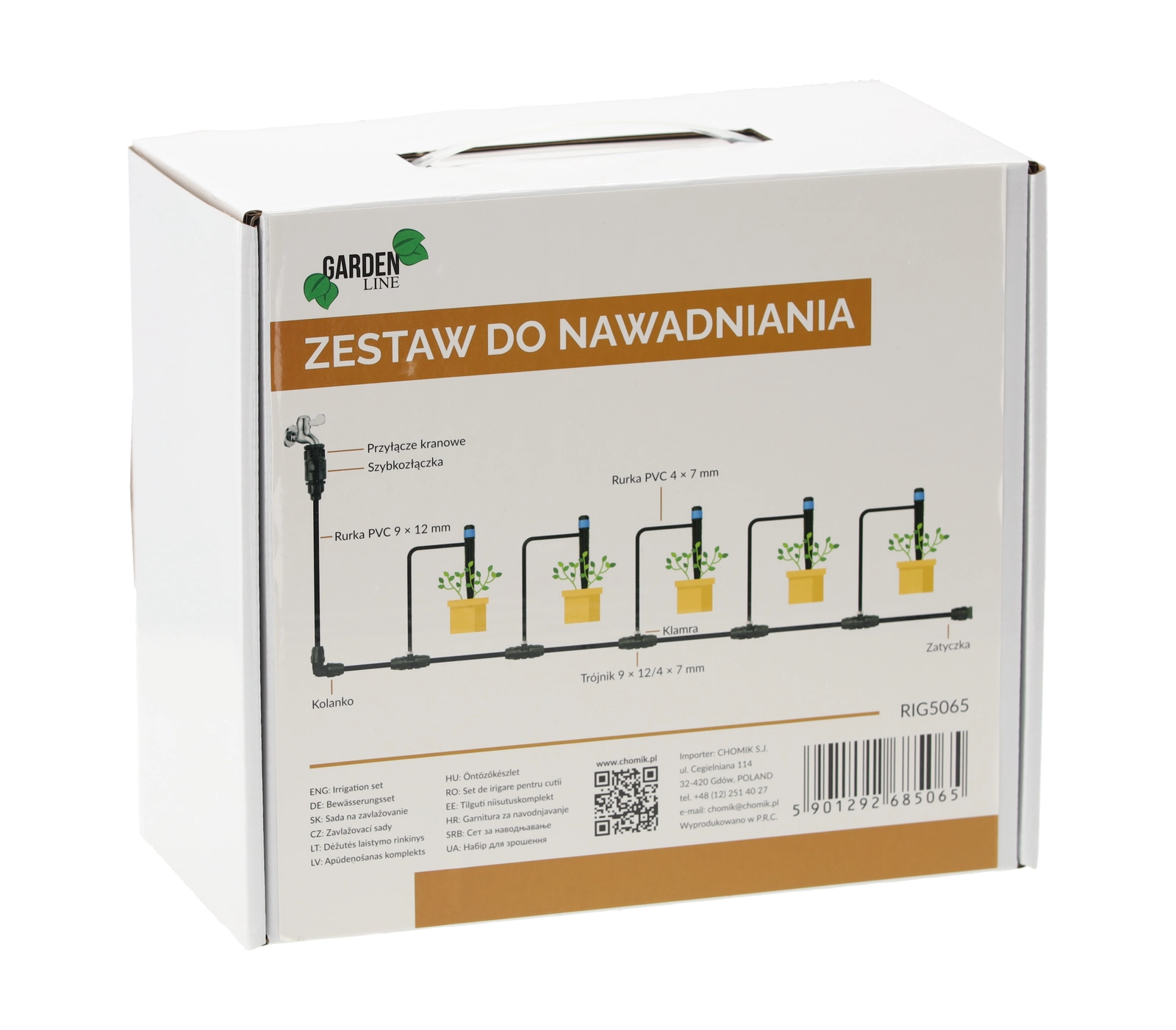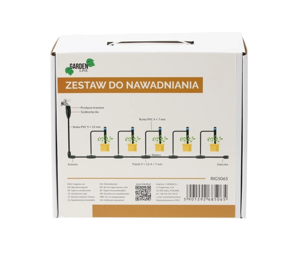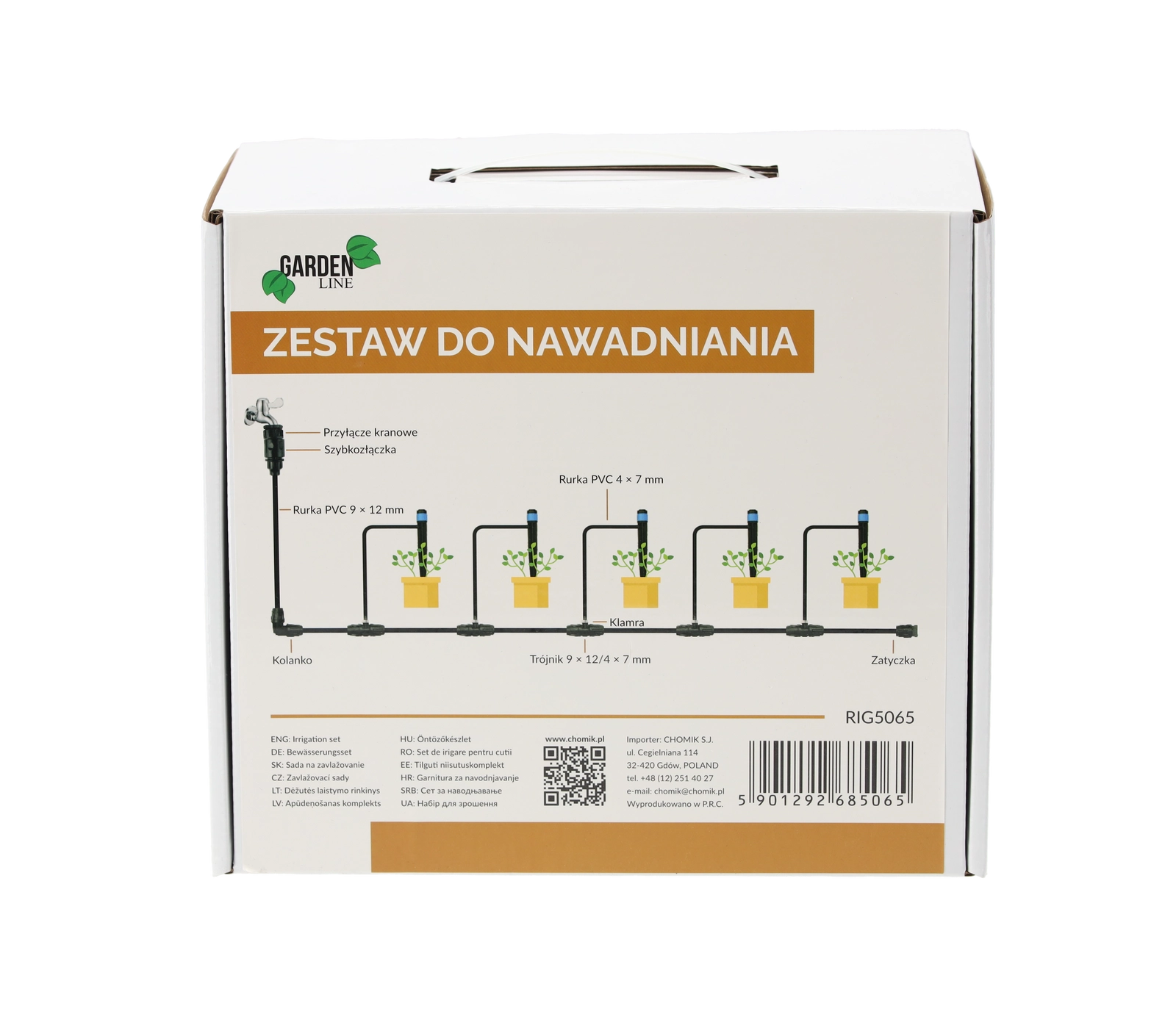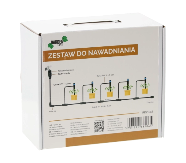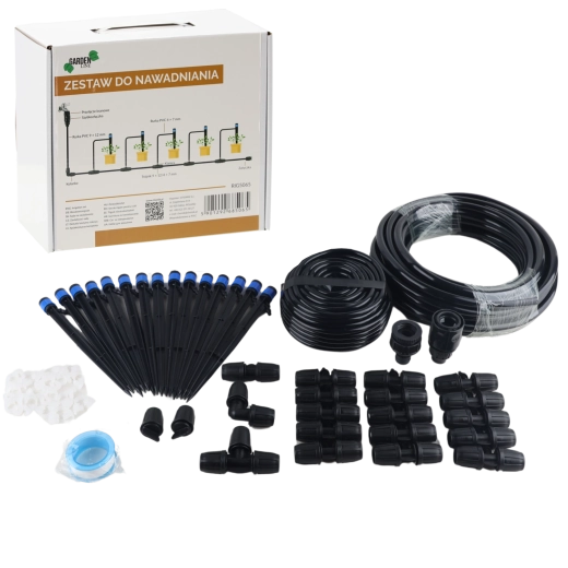 Wszystko, czego potrzebujesz, w jednym pudełku: kroplowniki, węże, złączki, trójniki, końcówki oraz taśma teflonowa. Złożysz i uruchomisz w kilka chwil.