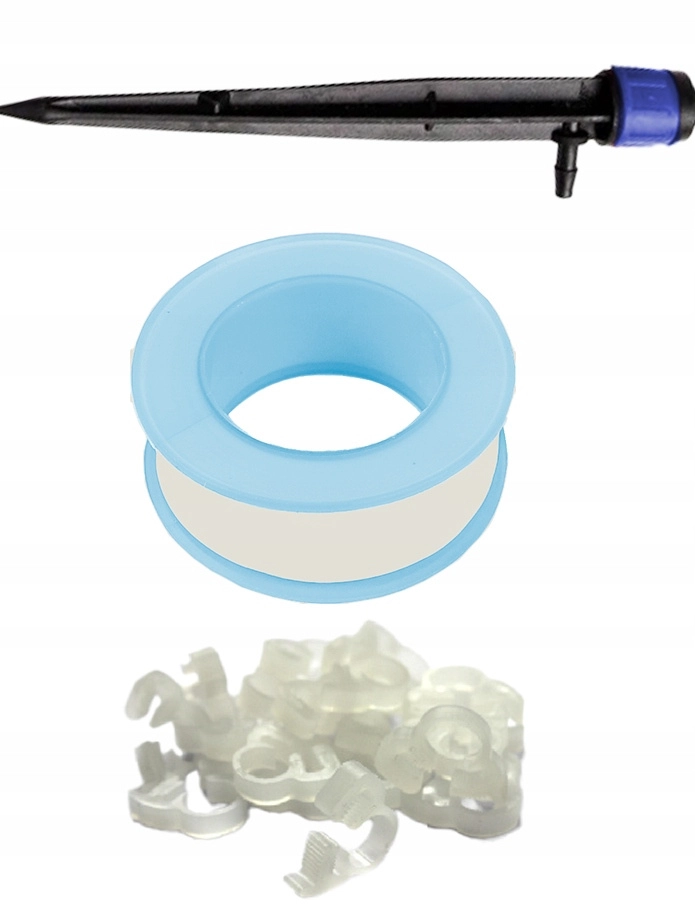 W opakowaniu znajdziesz węże 9×12 mm i 3×5 mm, złączki, trójniki, kolanko, końcówki, szybkozłączkę, przyłączkę do kranu, 15 kroplowników oraz 15 klipsów do łatwego prowadzenia instalacji. Taśma teflonowa pomaga idealnie uszczelnić połączenia gwintowane i zapobiegać wyciekom.