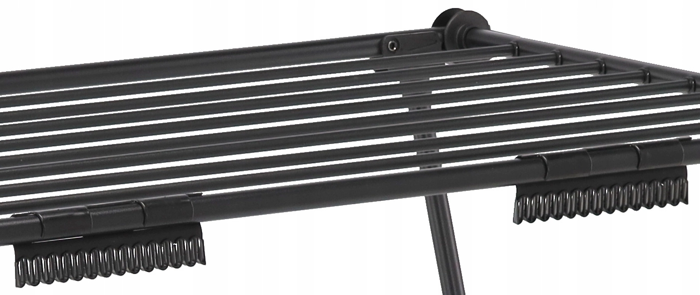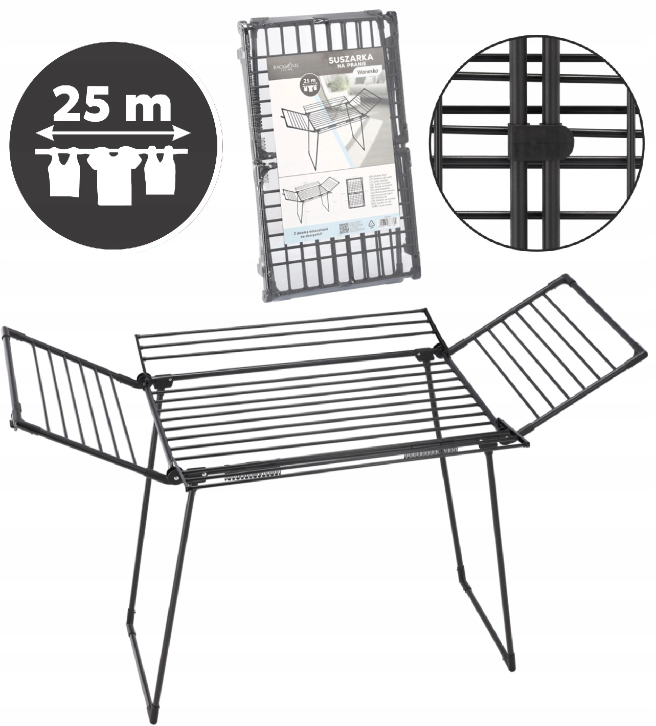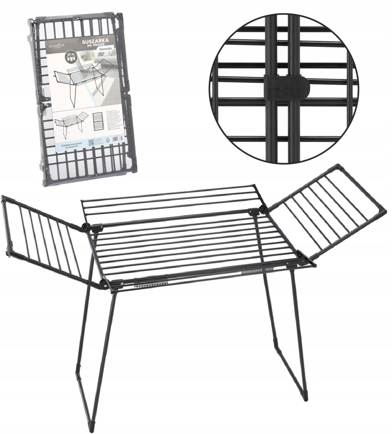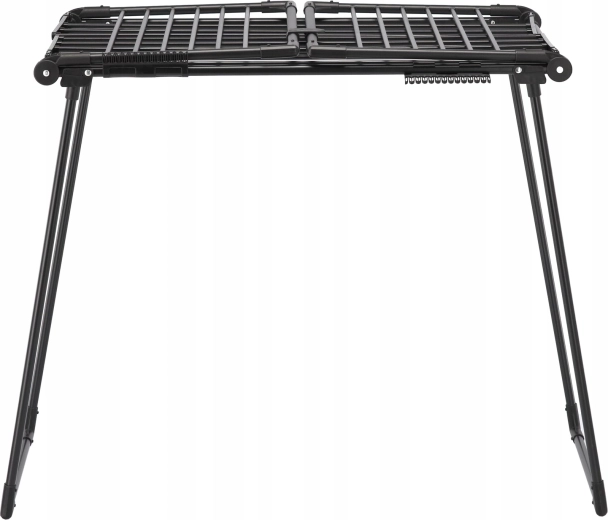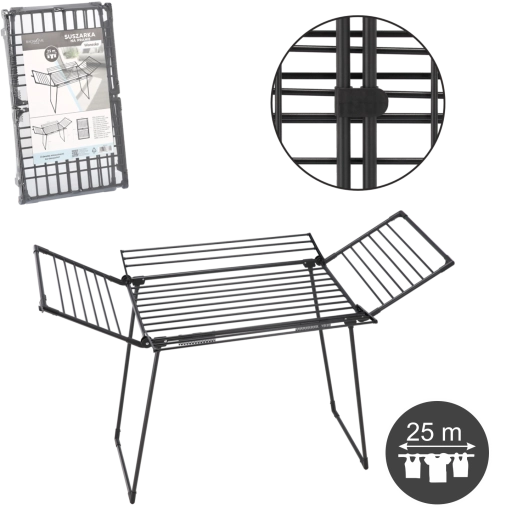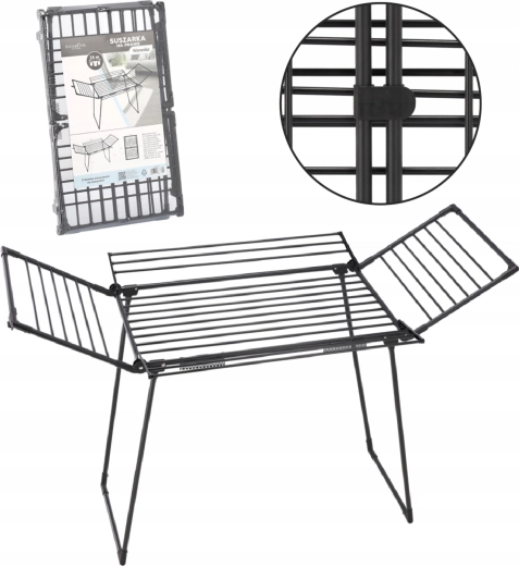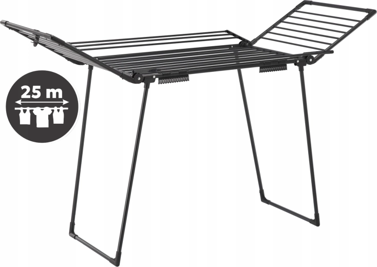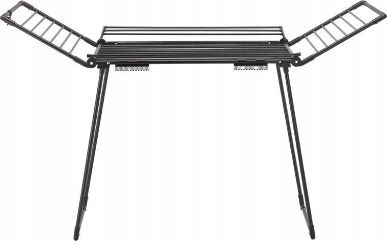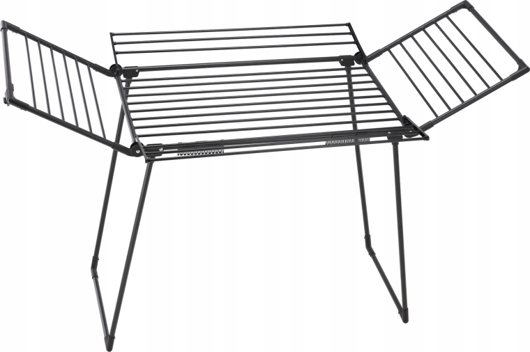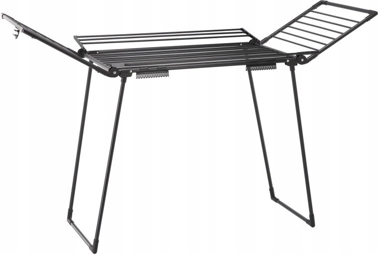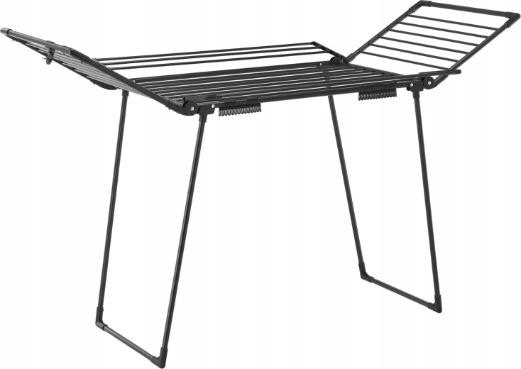 Przestronna składana suszarka na pranie z regulowaną szerokością i dwoma uchwytami na skarpetki dla efektywnego suszenia. Stabilna konstrukcja z stali malowanej proszkowo w kolorze matowej czerni, cztery ramiona dla maksymalnego wykorzystania miejsca oraz łatwe składanie oszczędzające przestrzeń.