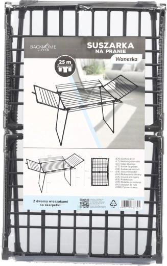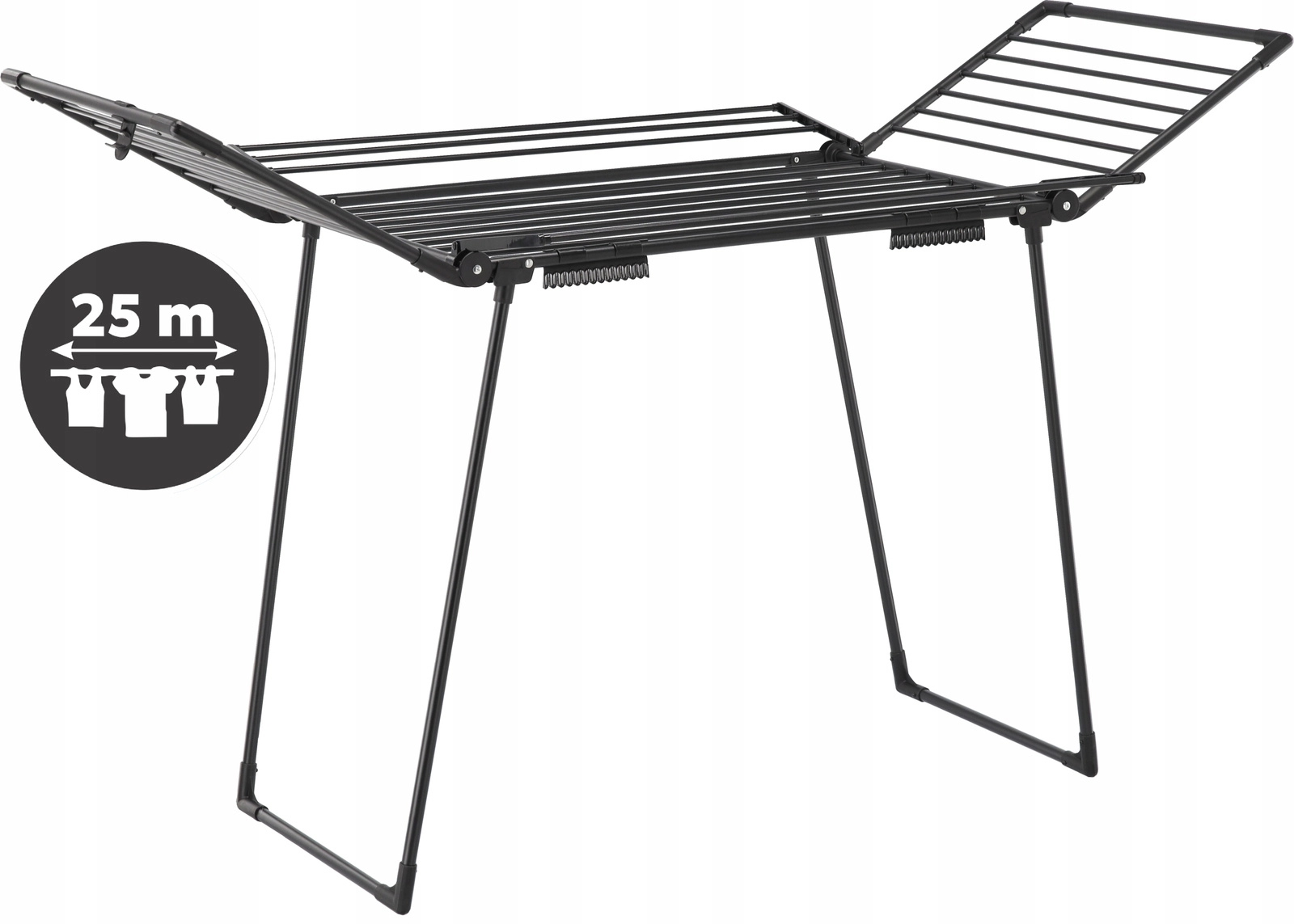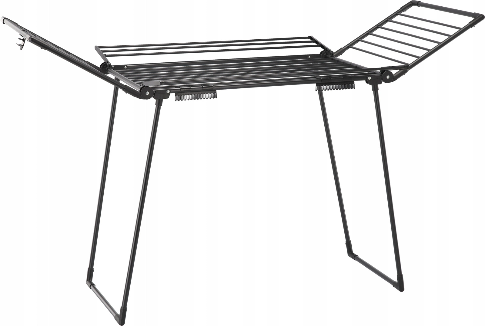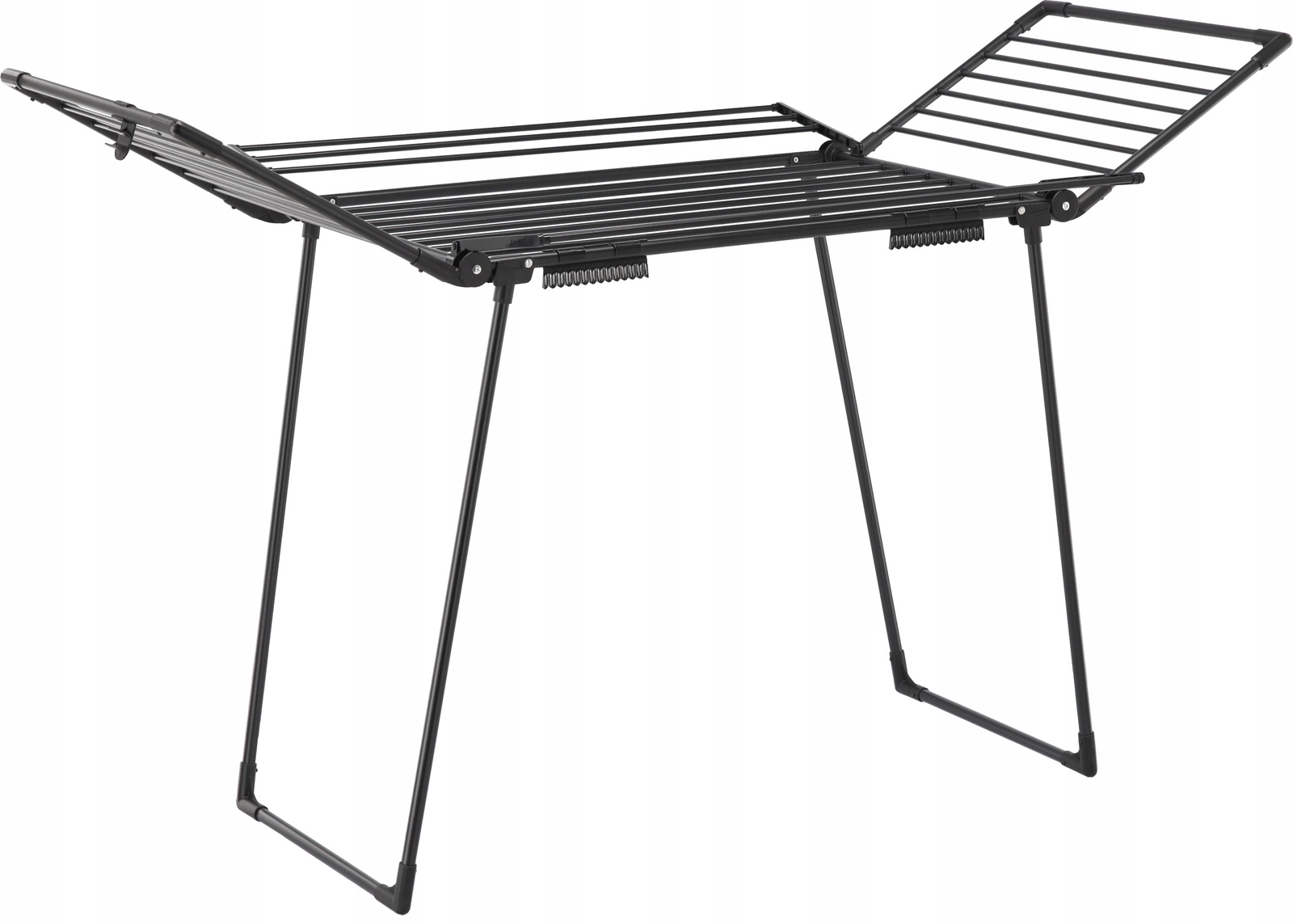 Praktyczna suszarka Waneska oferuje dużą powierzchnię do suszenia dzięki czterem ramionom i odchylanym skrzydłom. Dzięki solidnej stalowej ramie z powłoką proszkową w matowej czerni wytrzymuje codzienne użytkowanie w domu i na balkonie. Dwa zintegrowane uchwyty na skarpetki utrzymują drobne elementy garderoby w porządku i bez klamerek.