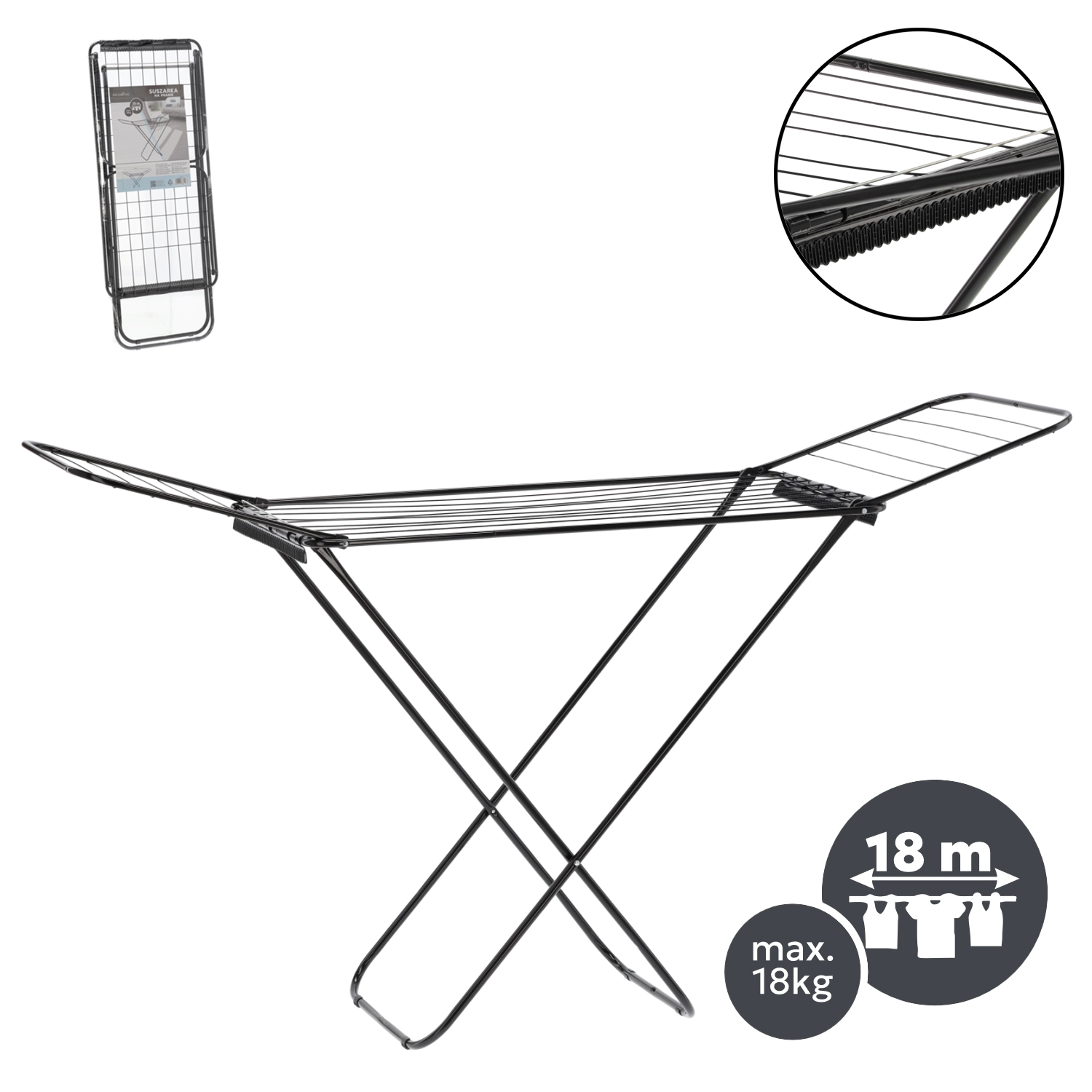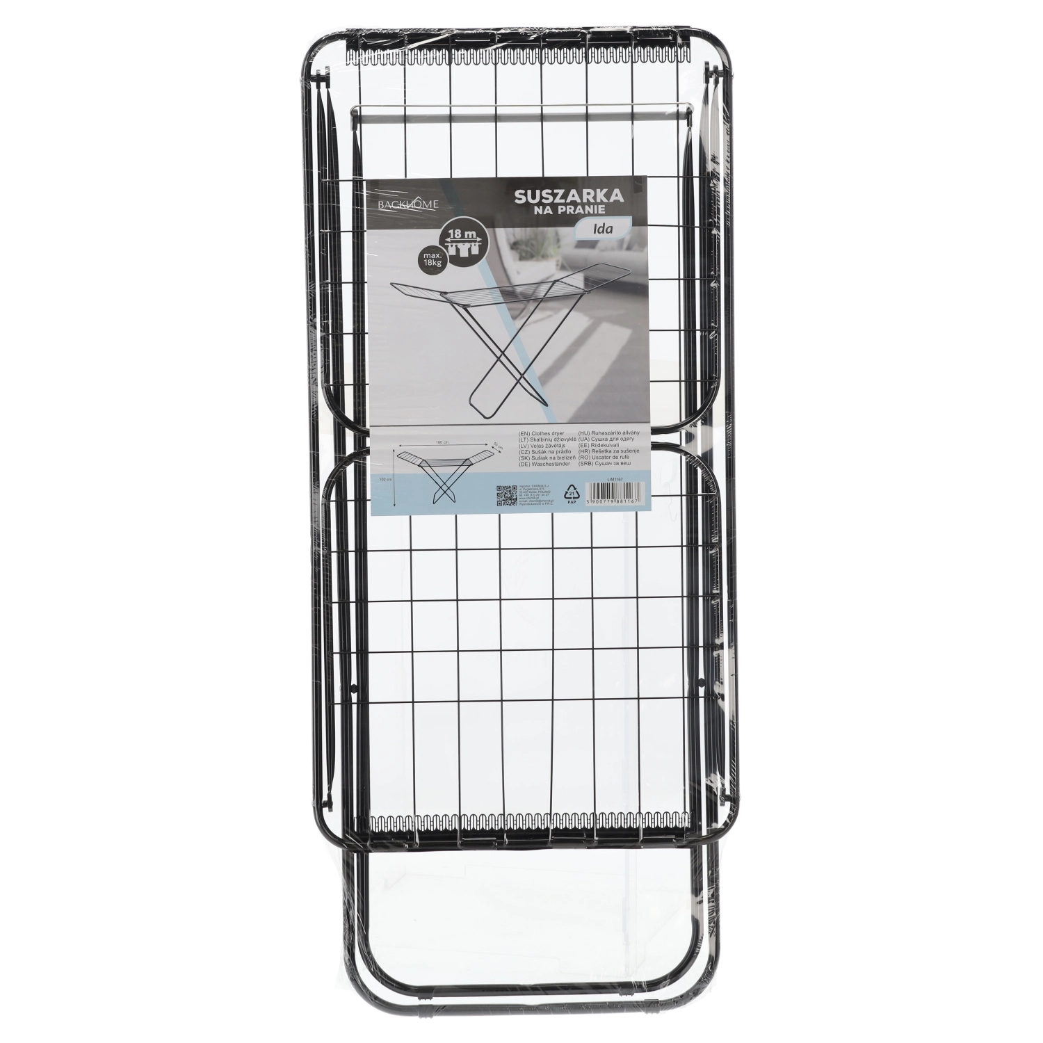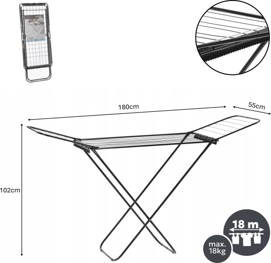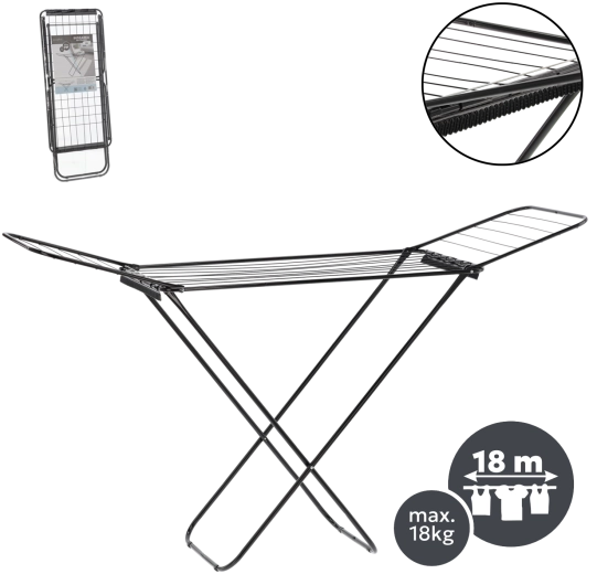Praktyczna i stylowa suszarka na pranie z rozkładanymi skrzydłami oferuje aż 18 m powierzchni suszenia oraz dwa uchwyty na skarpetki dla drobnych elementów garderoby. Dzięki solidnej stalowej konstrukcji, matowoczarnemu wykończeniu i składanemu designowi oszczędza miejsce i ułatwia codzienne suszenie bez prądu.