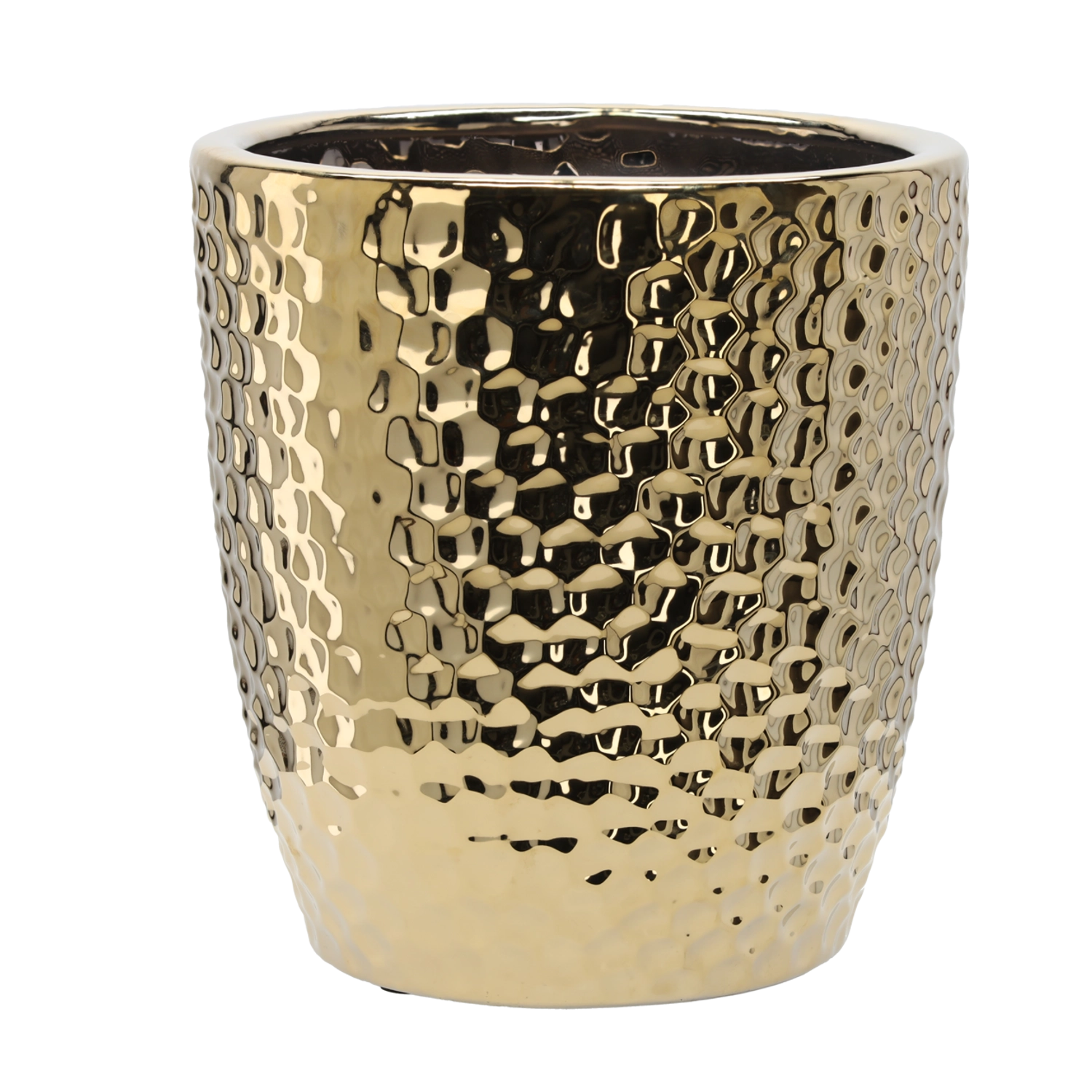Elegancka ceramiczna osłona na donicę w złotym kolorze z wyrazistym wzorcem plastrów miodu i błyszczącą powierzchnią doda wnętrzu luksusu i nowoczesnego stylu. Wysokiej jakości ceramika gwarantuje trwałość i długą żywotność.