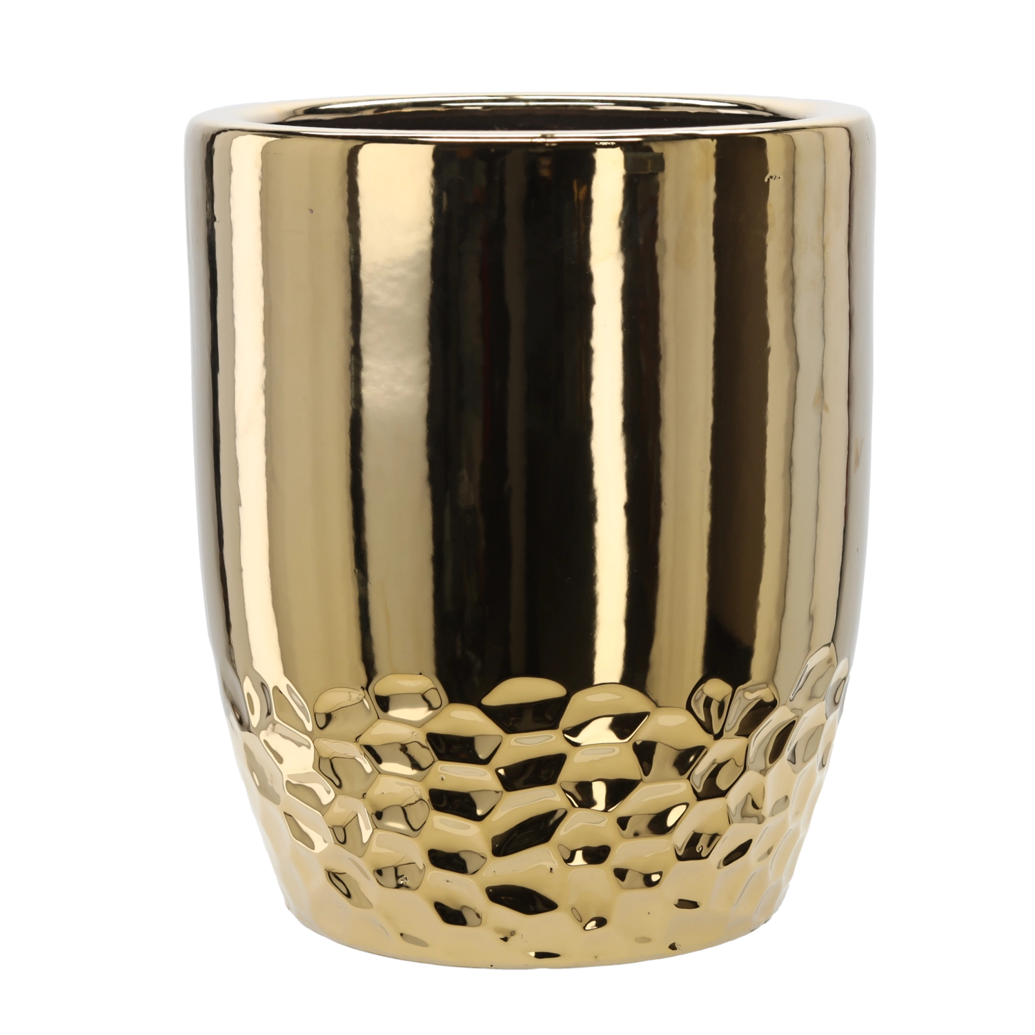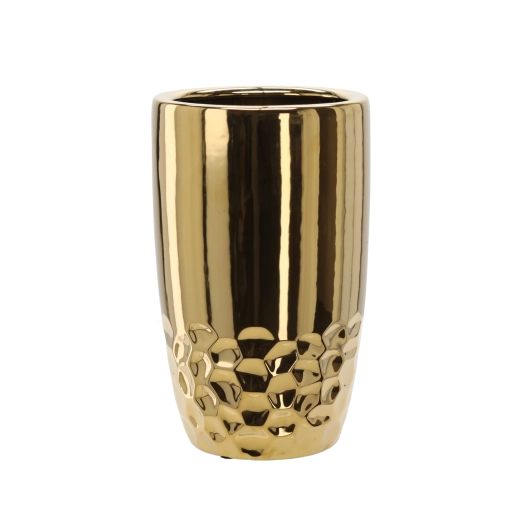 Ta nowoczesna donica w złotym wykończeniu doskonale podkreśli zieleń i stanie się stylową dominantą salonu, holu lub biura. Trwała konstrukcja ceramiczna lepiej utrzymuje stabilność wyższych roślin, a przy tym jest łatwa w pielęgnacji.