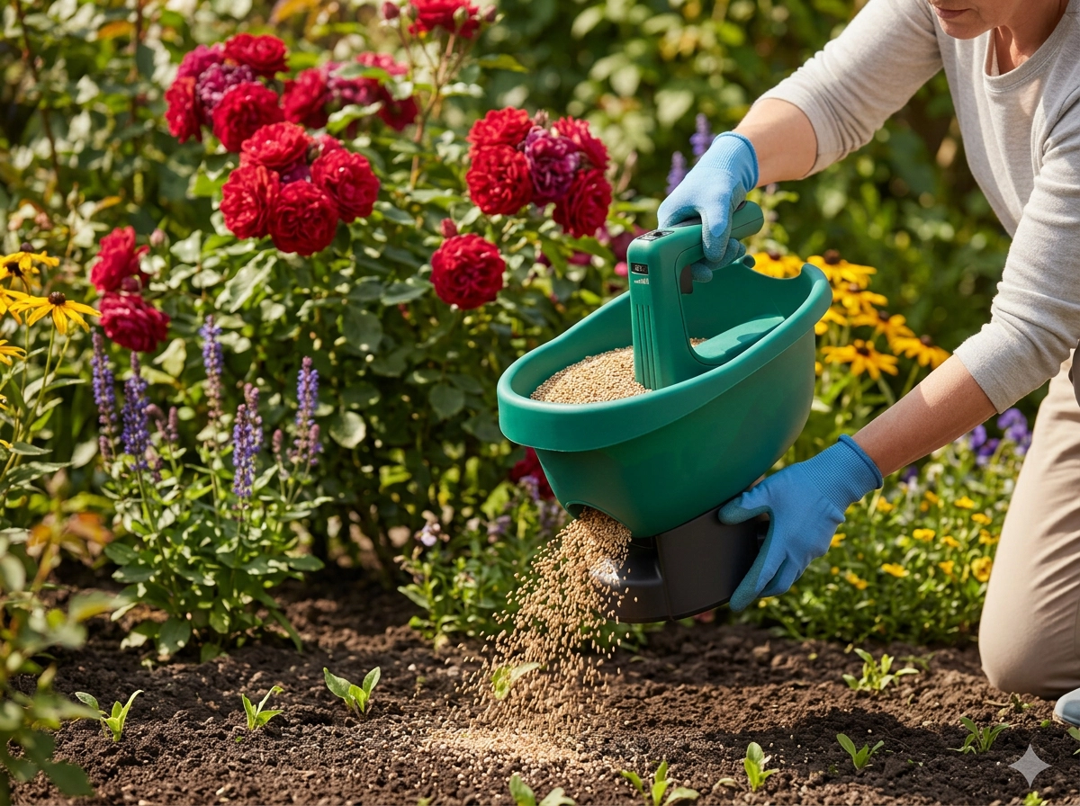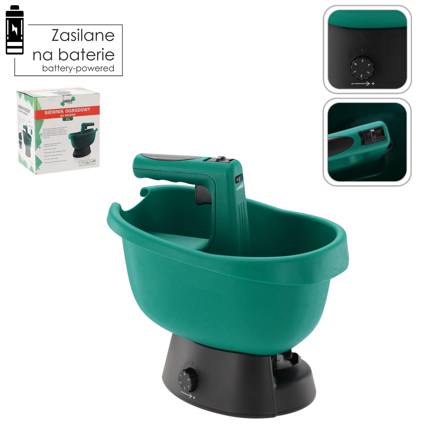 Kontroluj ilość materiału oraz prędkość obrotów dla równomiernych efektów bez marnowania – idealne do nasion, nawozów i posypu.