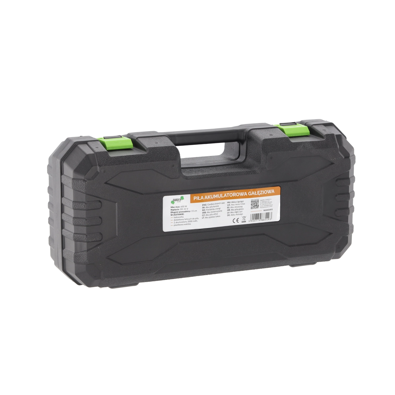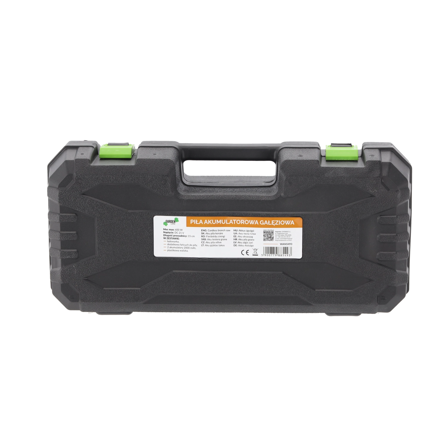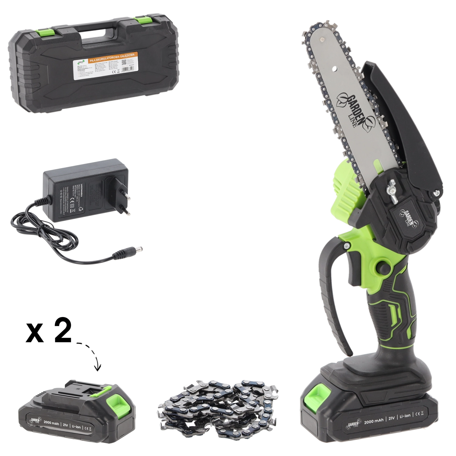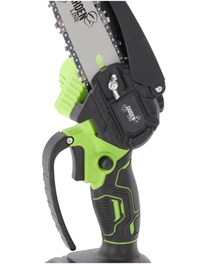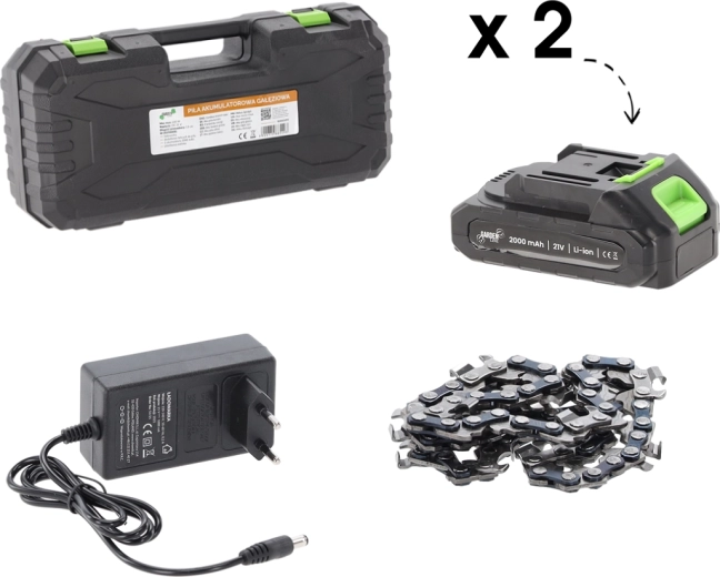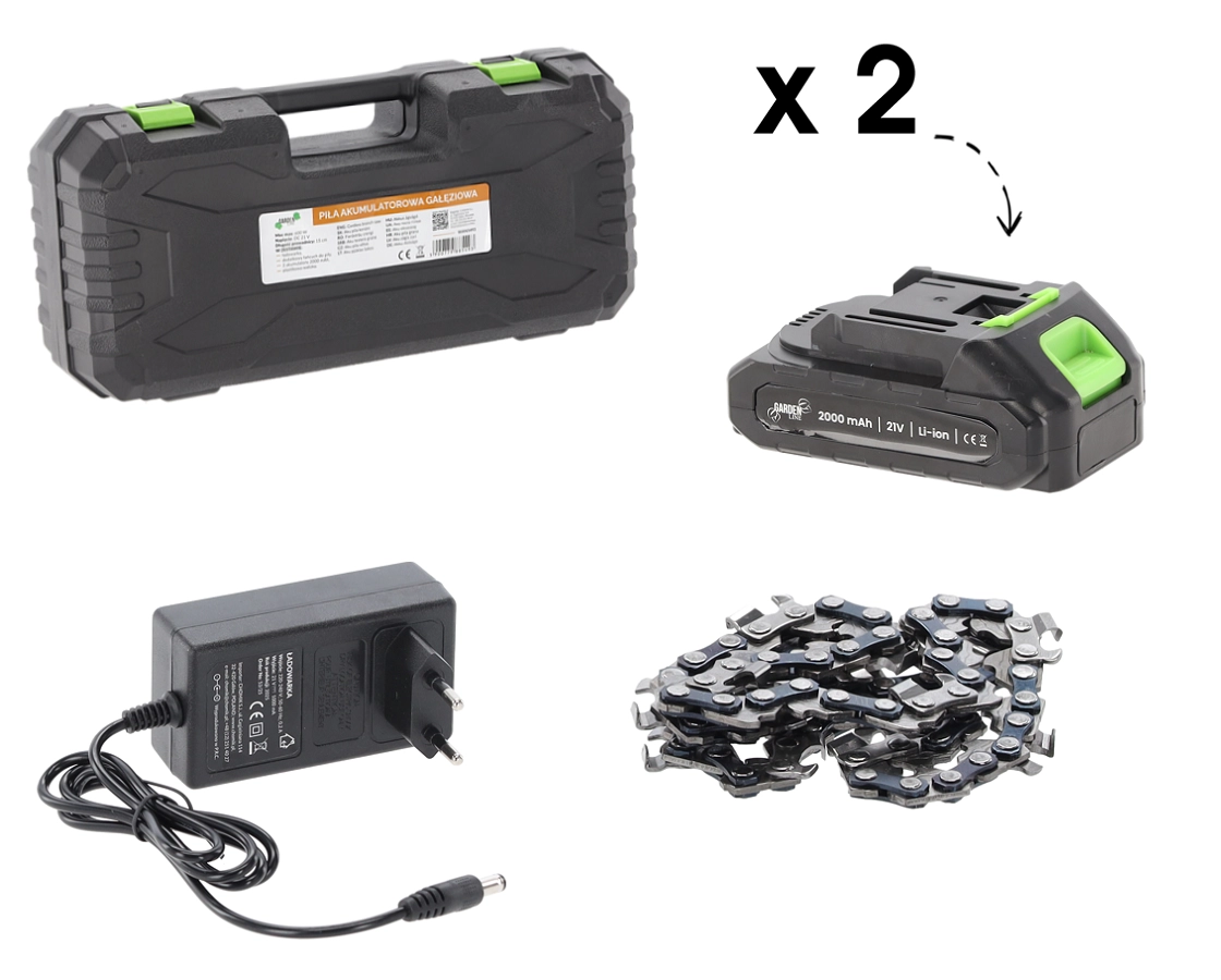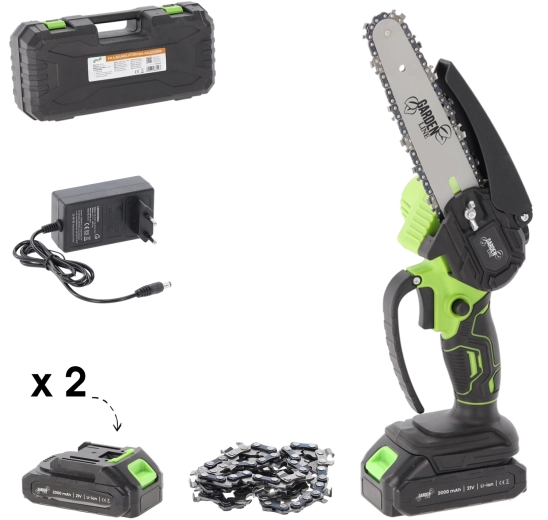 Wydajny silnik 600 W z prędkością łańcucha 8 m/s zapewnia płynne i czyste cięcia, a osłona oraz ergonomiczny uchwyt zwiększają bezpieczeństwo i komfort. Dwa akumulatory 1500 mAh wydłużają czas pracy i gwarantują pełną mobilność bez kabli.