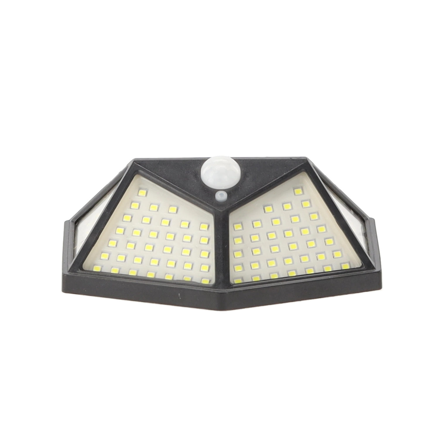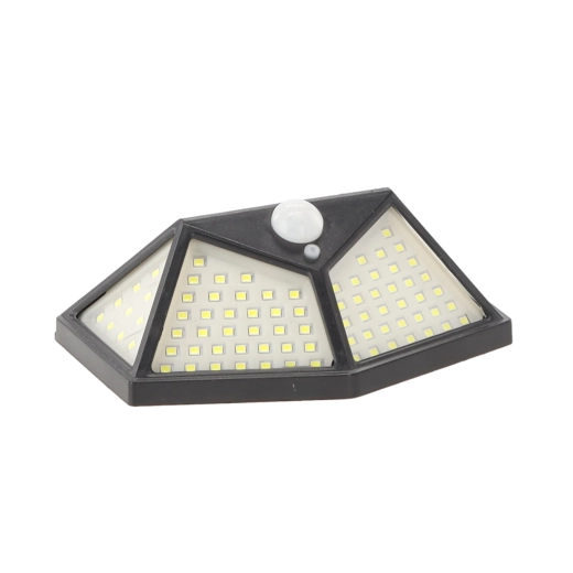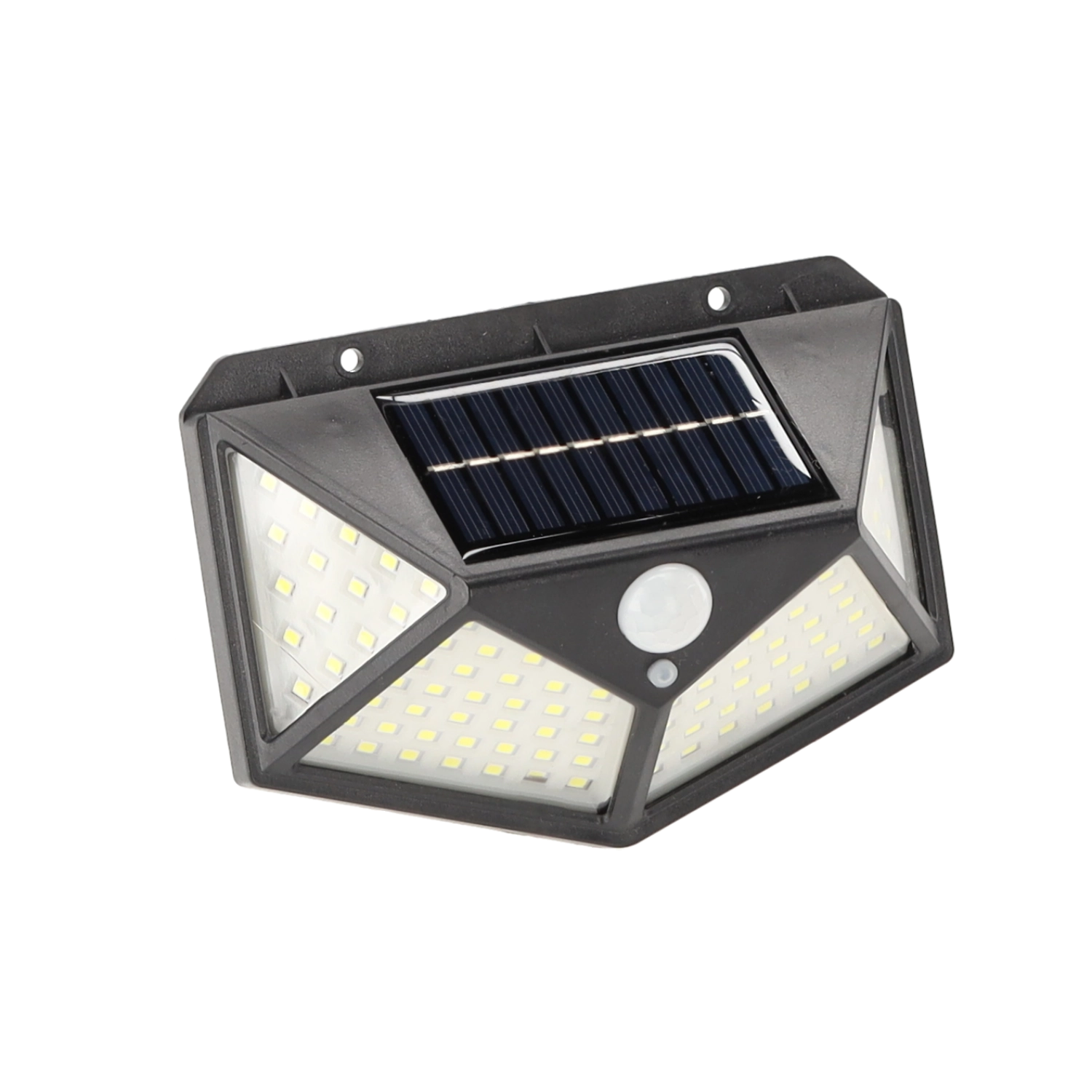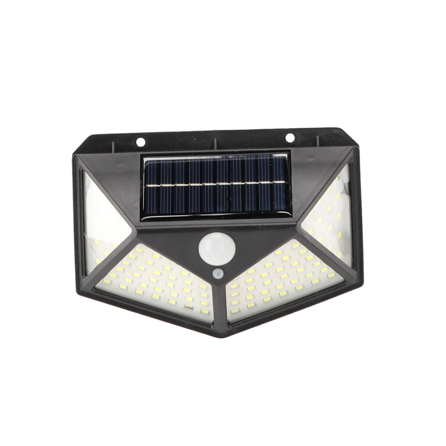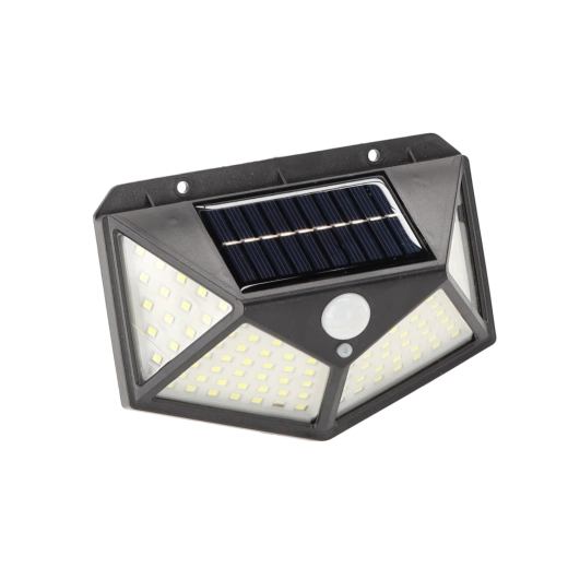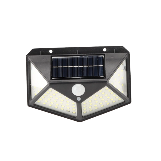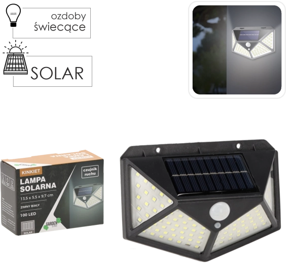 Praktyczne oświetlenie zewnętrzne z ładowaniem solarnym zapewnia szerokokątne doświetlenie dzięki gęstemu polu 100 diod LED. Zintegrowany czujnik PIR reaguje na ruch – światło włącza się po wykryciu i wyłącza przy braku aktywności, gwarantując bezpieczne przejście i oszczędność energii.