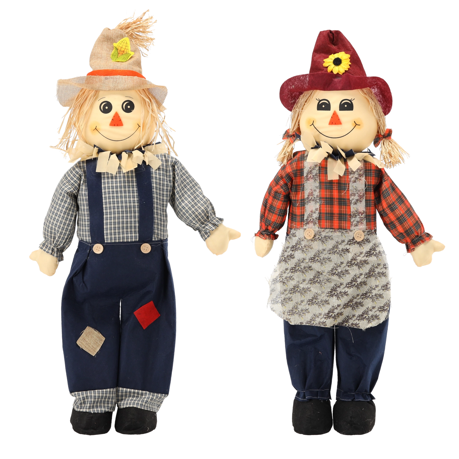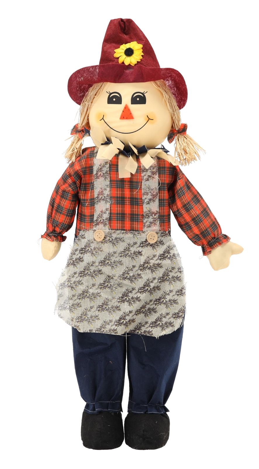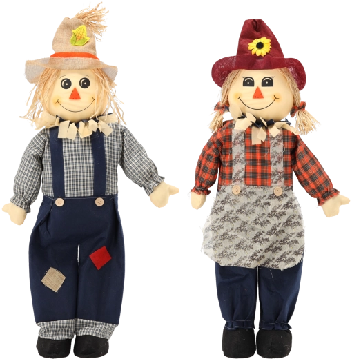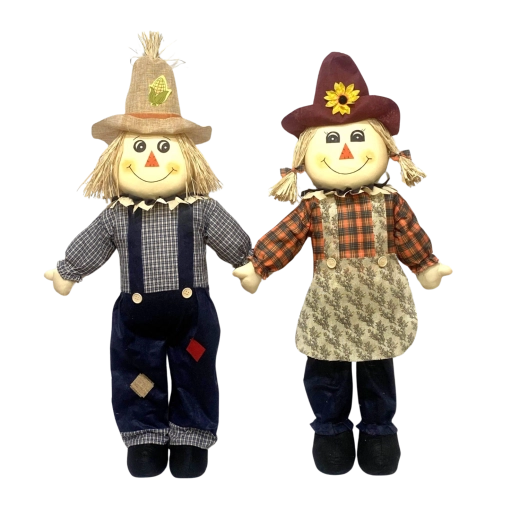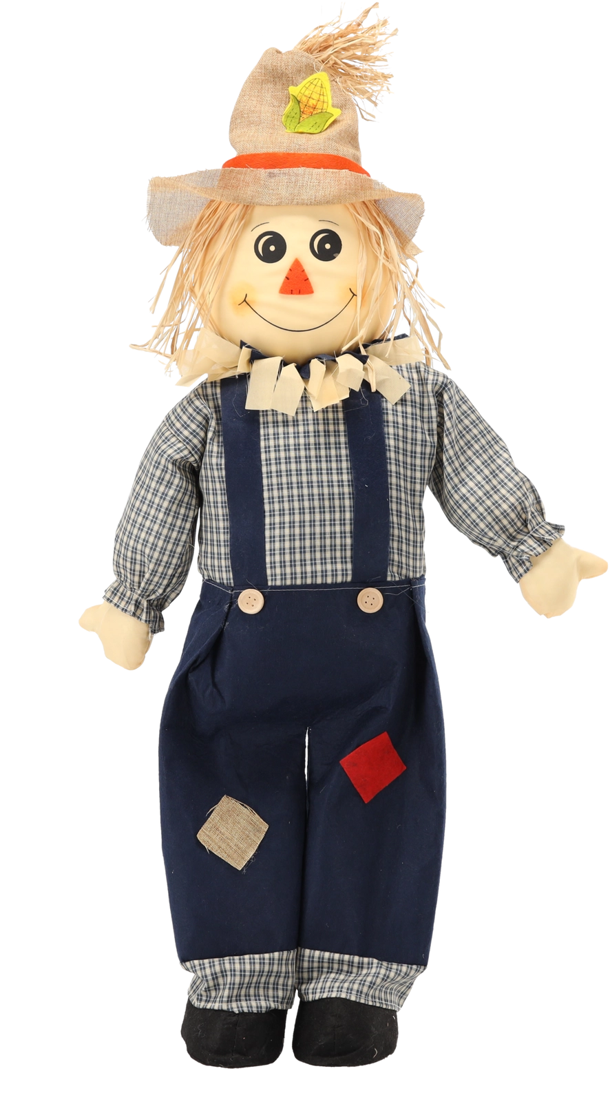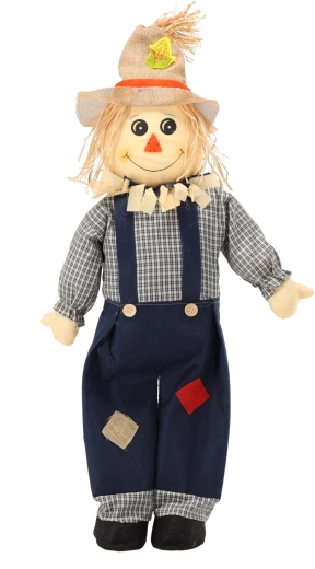 Efektowny wizualnie strach na wróble wykonany jest z materiałów tekstylnych z dbałością o detale – od kapelusza i ogrodniczek po naszyte ozdobne łaty. Doskonale pasuje do jesiennych aranżacji, a jednocześnie praktycznie pomaga w odstraszaniu ptaków z rabat i skrzynek.