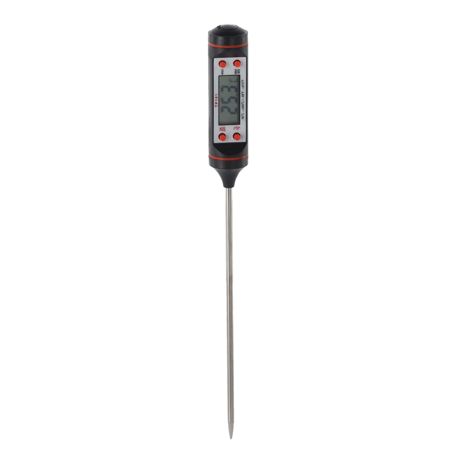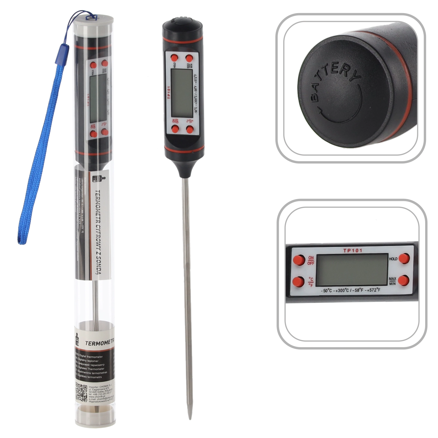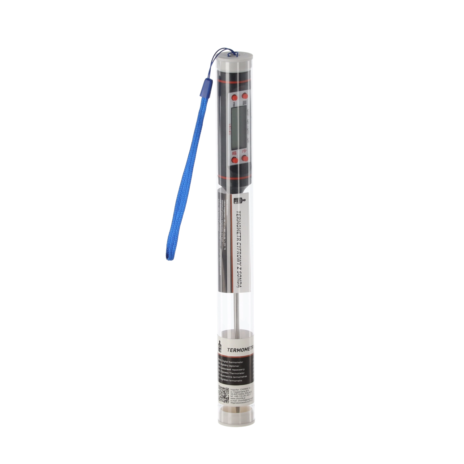 Cyfrowy kuchenny termometr z metalową sondą o długości 22,5 cm jest idealny do pomiarów w głębokich garnkach, w mięsie oraz w wypiekach. Czytelny wyświetlacz LCD zapewnia szybki podgląd aktualnej temperatury, dzięki czemu osiągniesz perfekcyjne rezultaty bez zgadywania.