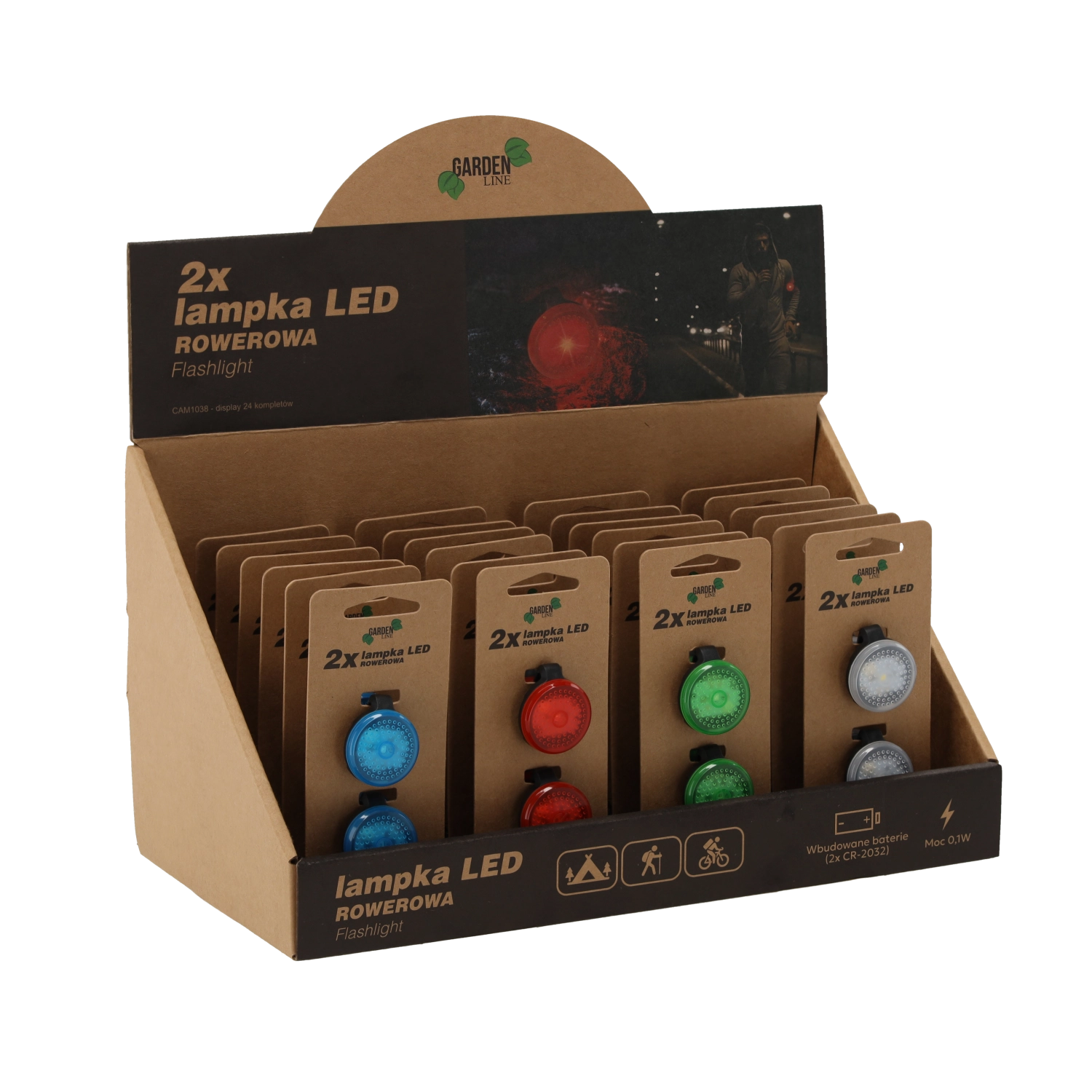Zestaw dostępny w mixie kolorów: biały, czerwony, niebieski i zielony. Połącz białe z przodu i czerwone z tyłu dla maksymalnego bezpieczeństwa.
