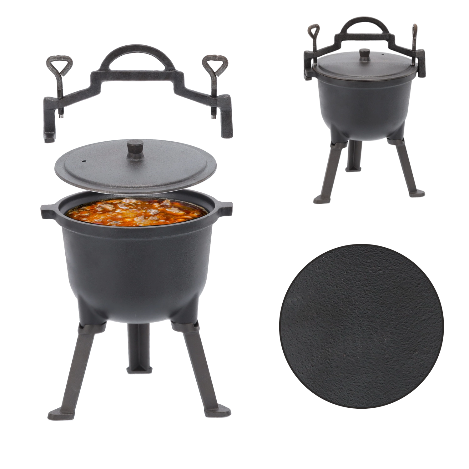 Trzy solidne nogi zapewniają pewne i bezpieczne ustawienie kociołka bezpośrednio nad żarzącymi się węglami lub płomieniem w palenisku.
