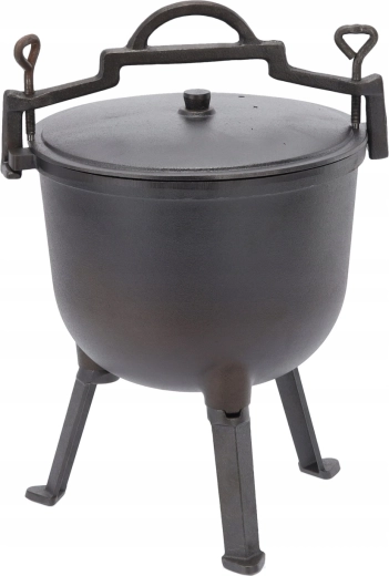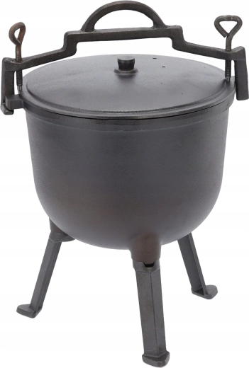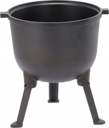 Solidny żelazny kociołek o pojemności 11 l jest idealny do gotowania w plenerze, w ogrodzie i podczas biwakowania. Dzięki masywnej żeliwnej konstrukcji potrawy nagrzewają się równomiernie, a naczynie długo trzyma ciepło. Stabilny trójnóg i praktyczna pokrywka zapewniają wygodne i bezpieczne gotowanie dla całej ekipy.