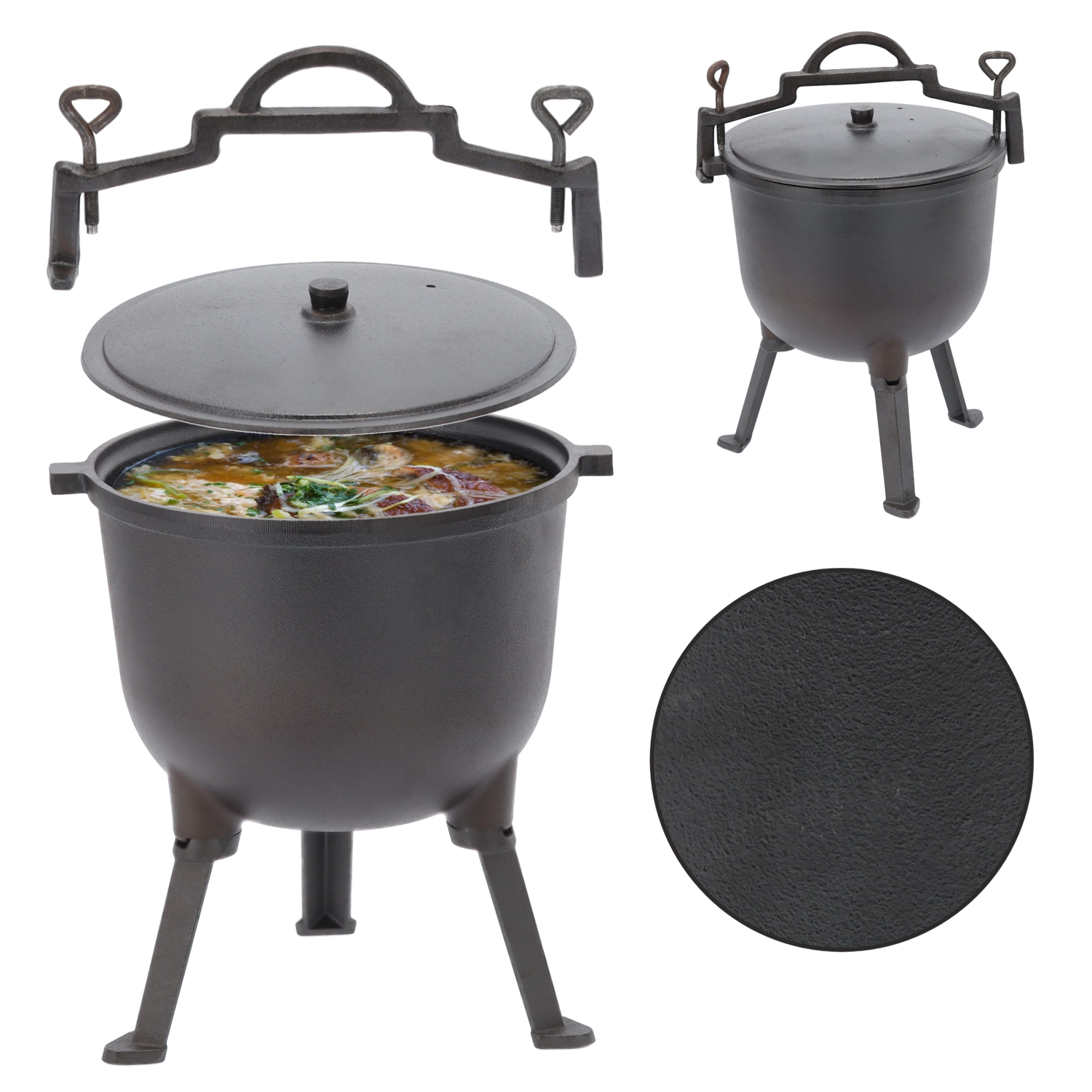 Ciężka pokrywka pomaga utrzymać wilgoć i aromat wewnątrz, a solidny uchwyt umożliwia bezpieczne przenoszenie lub zawieszenie kociołka nad ogniem.