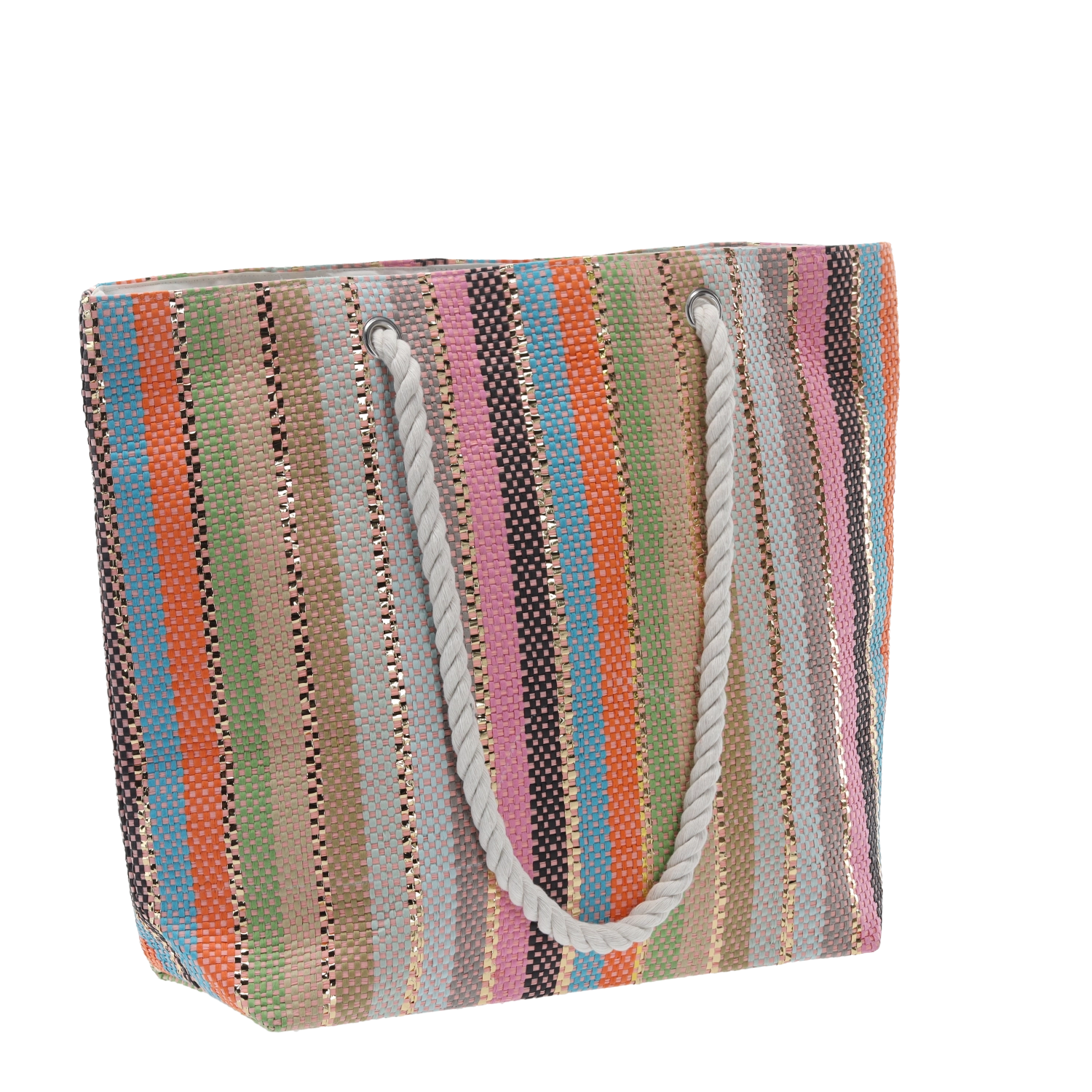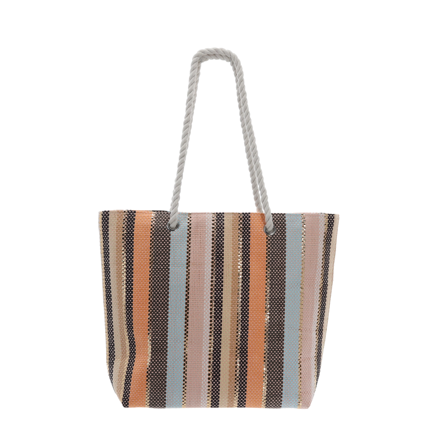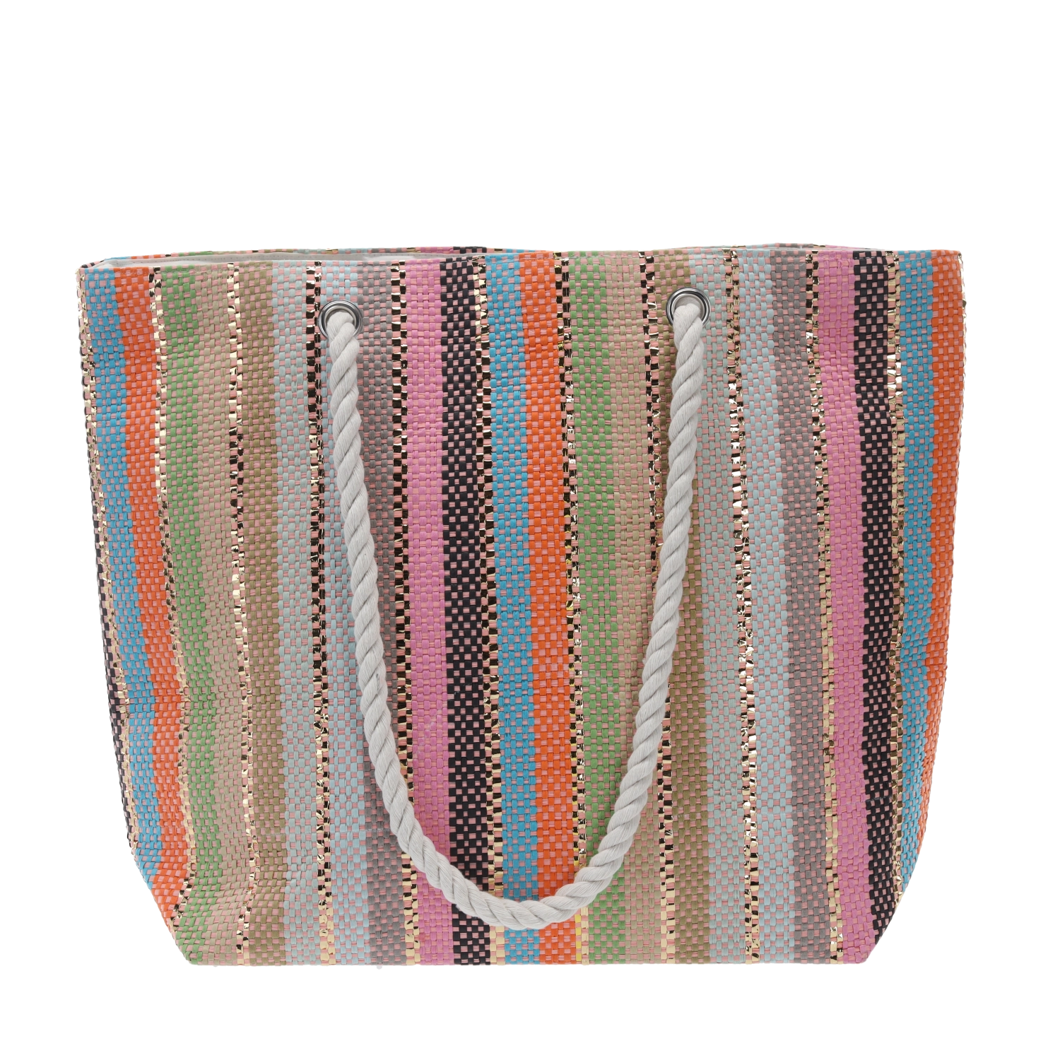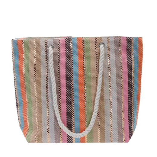 Ta przestronna plażowa torba wyróżnia się świeżym, pasiastym designem i wygodnymi, linowymi uchwytami do noszenia na ramieniu. Otwarty górny dostęp umożliwia szybkie sięganie po rzeczy, a sztywniejsze tekstylne korpus utrzymuje kształt i lekkość podczas całodziennego użytkowania.