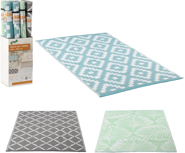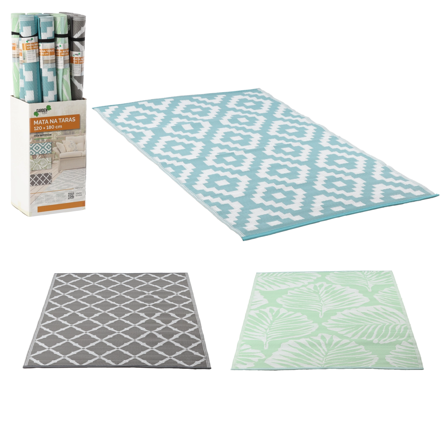 Wymiar 120 × 180 cm jest idealny pod meble ogrodowe, do wyznaczenia strefy relaksu lub jako baza pod dziecięce zabawy. Mix wzorów w odcieniach zieleni, szarości i turkusu z łatwością dopasujesz do różnych stylów wyposażenia.