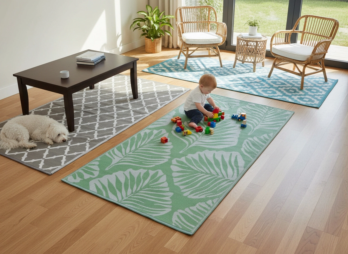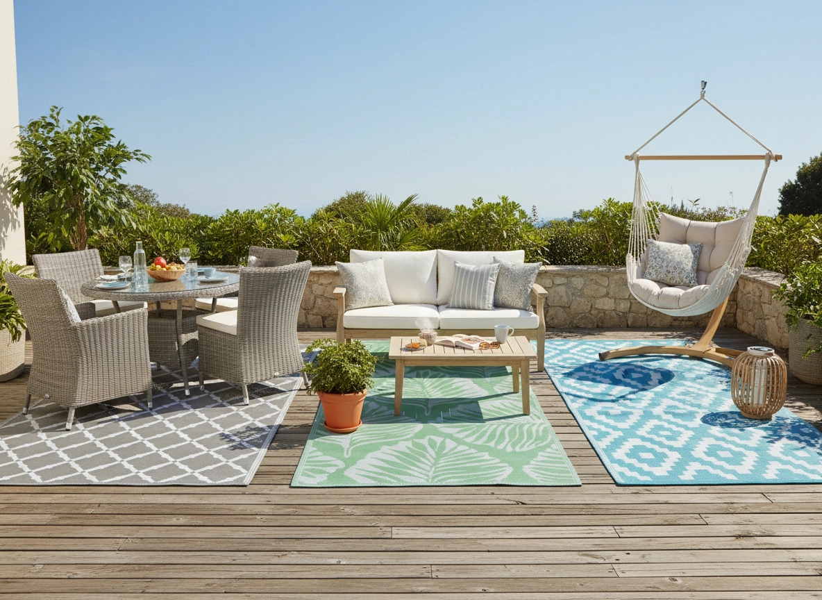 Płaski dywan z polipropylenu jest odporny na wilgoć i pogodę, szybko schnie i łatwo się czyści – idealny wybór do całosezonowego użytku na zewnątrz.