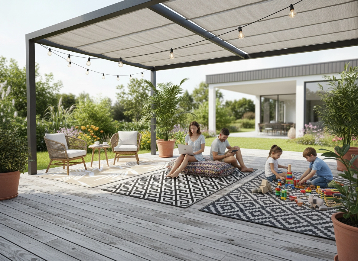 - Duży format 180 × 240 cm – idealny pod ogrodowe zestawy wypoczynkowe