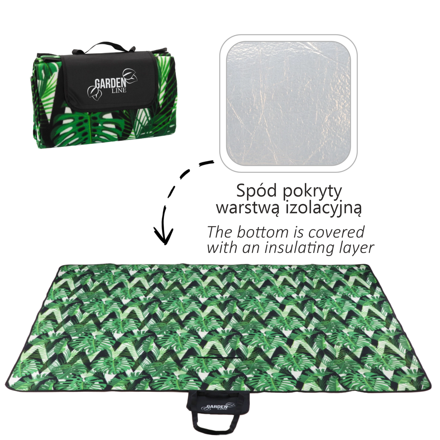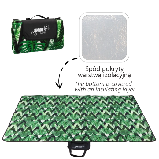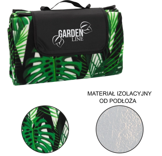 Ciesz się piknikiem, wypadem nad wodę lub relaksem w ogrodzie z kocem, który łączy wygodę i praktyczność. Górna miękka tkanina jest przyjemna w dotyku, środkowa warstwa z pianki tłumi nierówności podłoża, a dolna izolująca folia chroni przed wilgocią i chłodem. Tropikalny wzór Monstera doda Twojemu spotkaniu stylu.