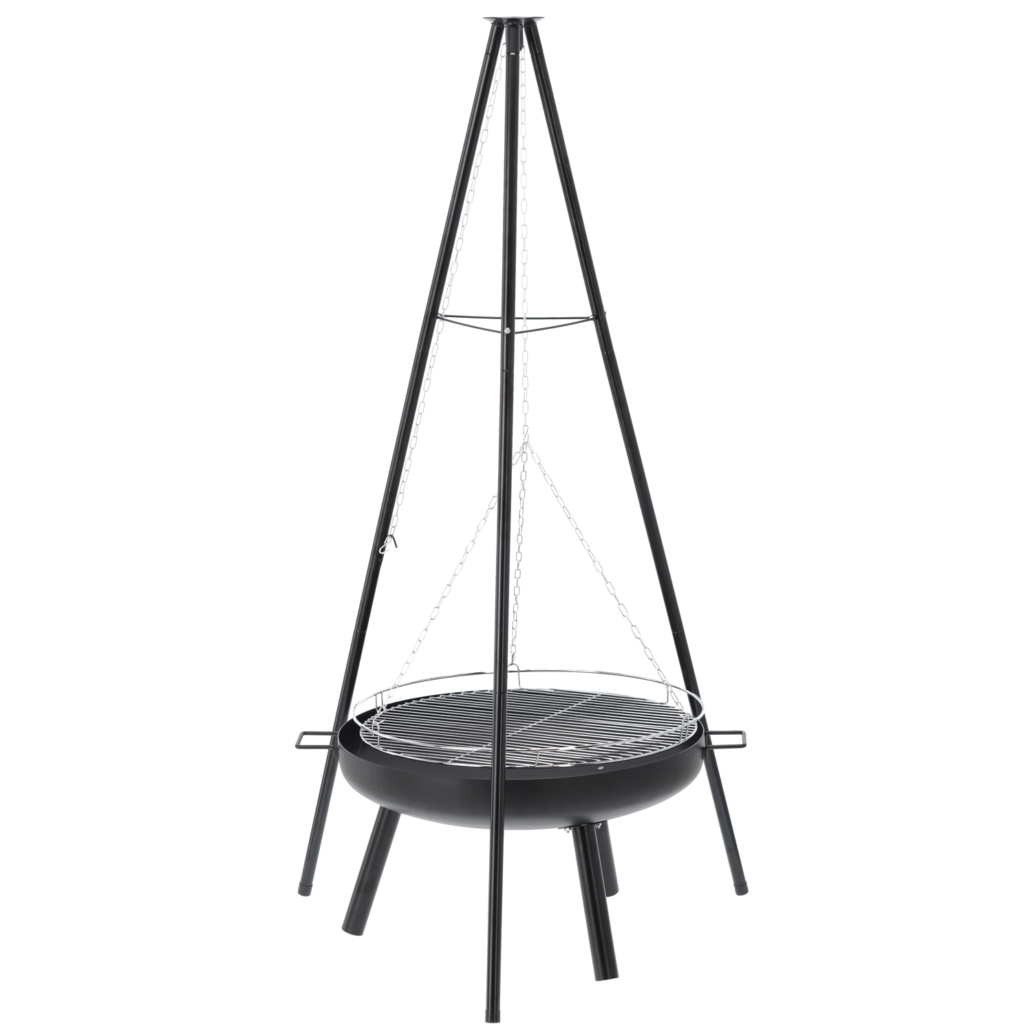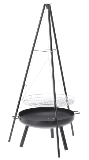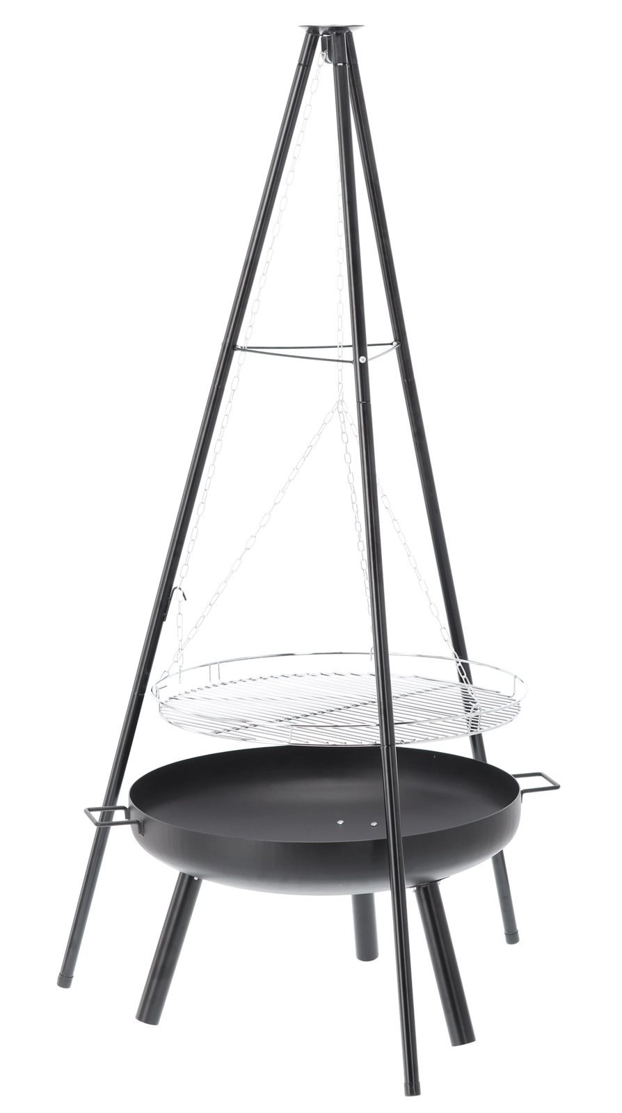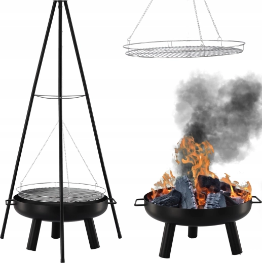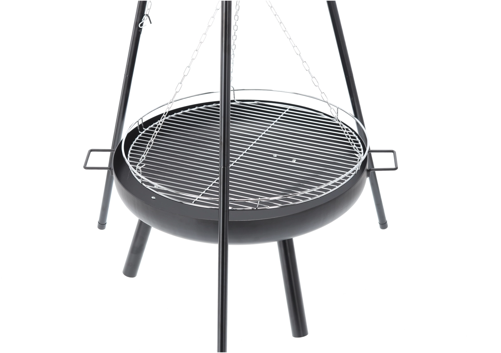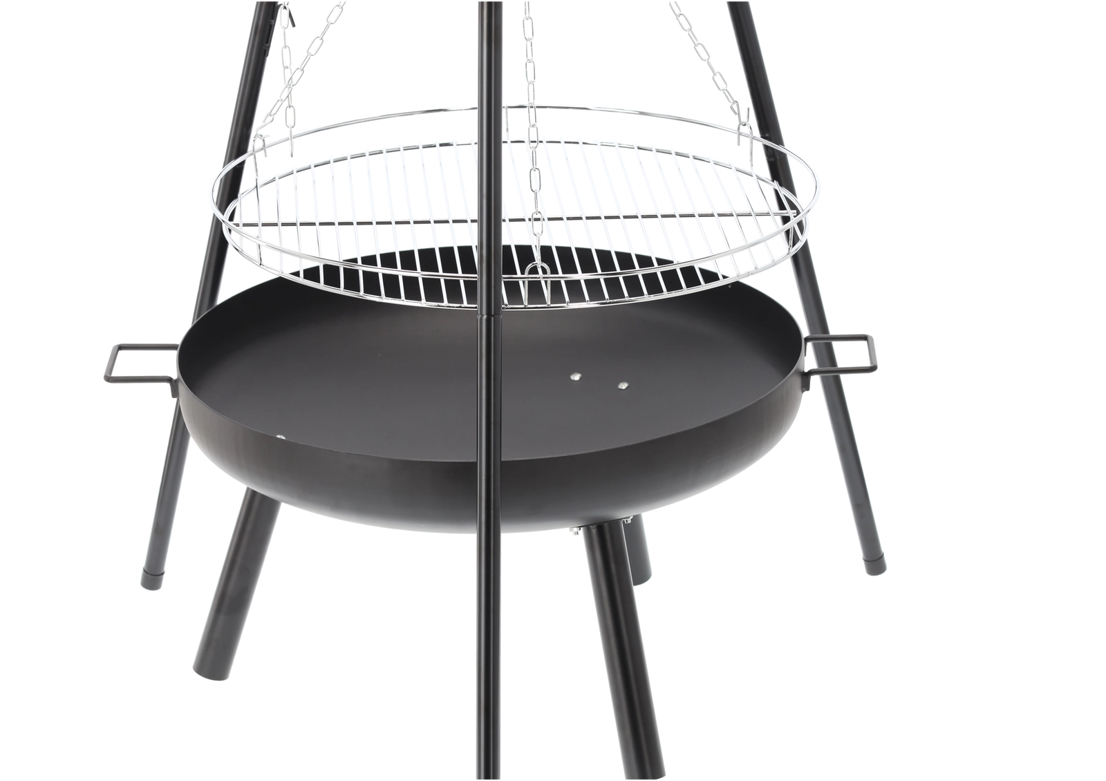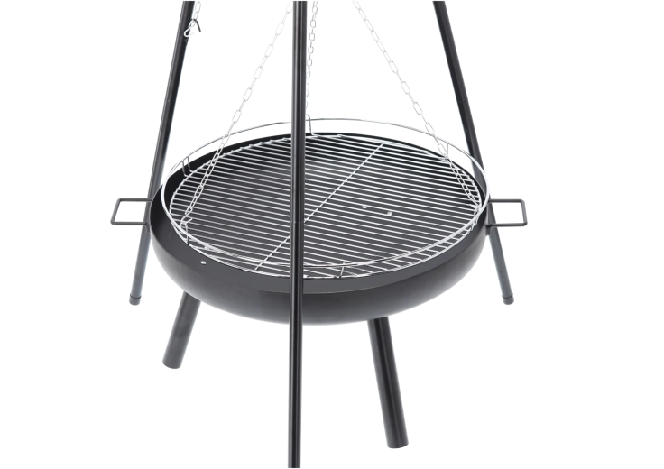 Stylowe rozwiązanie 2 w 1: palenisko i wiszący grill. Solidna stalowa misa o grubości 2 mm z czarną, odporną na wysoką temperaturę powłoką gwarantuje długą trwałość nawet przy częstym użytkowaniu. Dzięki wiszącemu rusztowi na łańcuchach łatwo ustawisz odległość od żaru i przygotujesz soczyste mięsa, warzywa oraz szaszłyki dokładnie tak, jak lubisz.