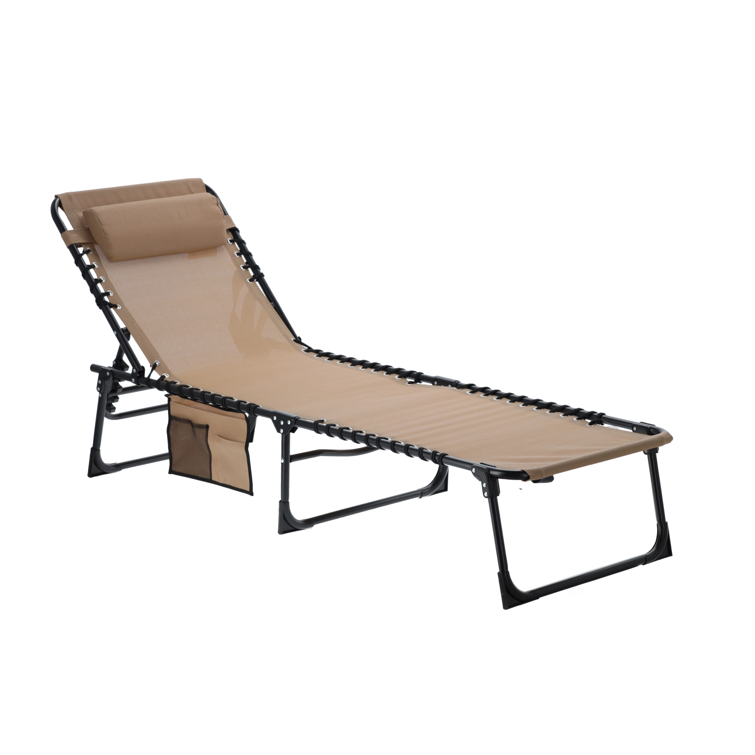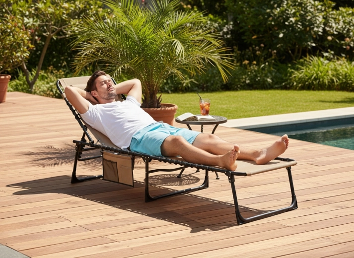 Ciesz się wygodą na świeżym powietrzu dzięki temu uniwersalnemu leżakowi, który z powodzeniem posłuży także jako polowe łóżko. Oferuje składaną konstrukcję, regulowane oparcie z poduszką, boczną kieszeń na drobiazgi oraz trwałą tkaninę rozpiętą na solidnej stalowej ramie – idealny przy basenie, na taras, do kempingu i na plażę.