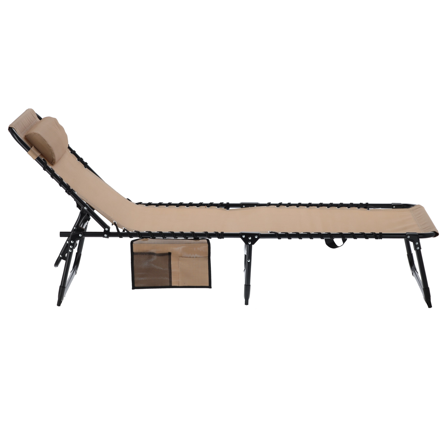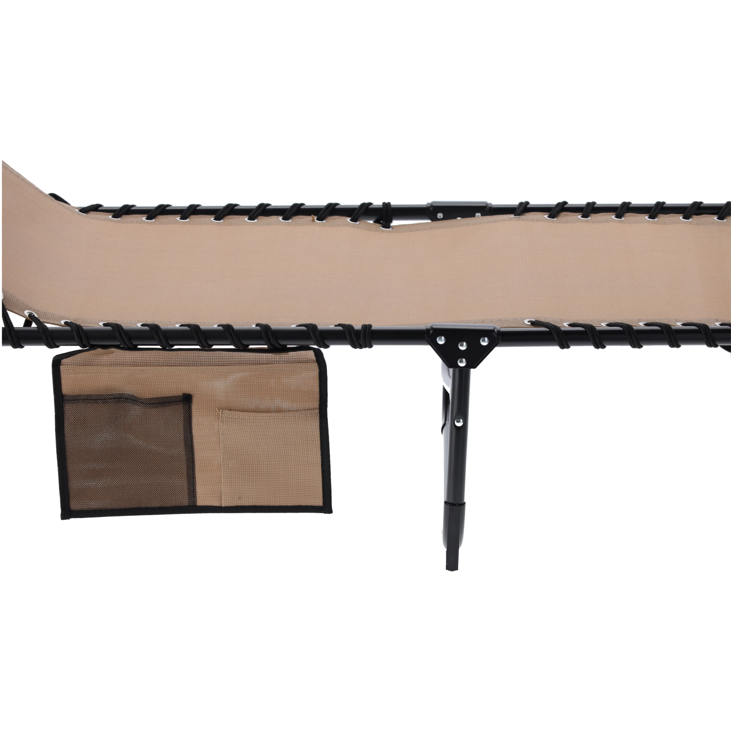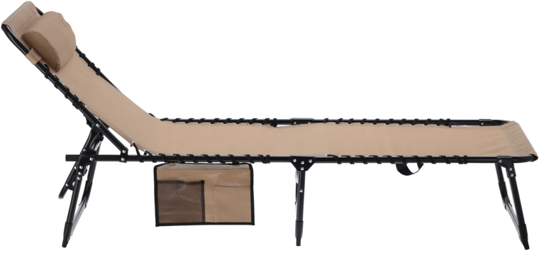 Dzięki stabilnym metalowym nogom i wytrzymałej tkaninie leżak jest gotowy na częste użytkowanie na zewnątrz. Boczna kieszeń utrzyma telefon, książkę czy okulary pod ręką, a składana rama ułatwi przenoszenie i przechowywanie.