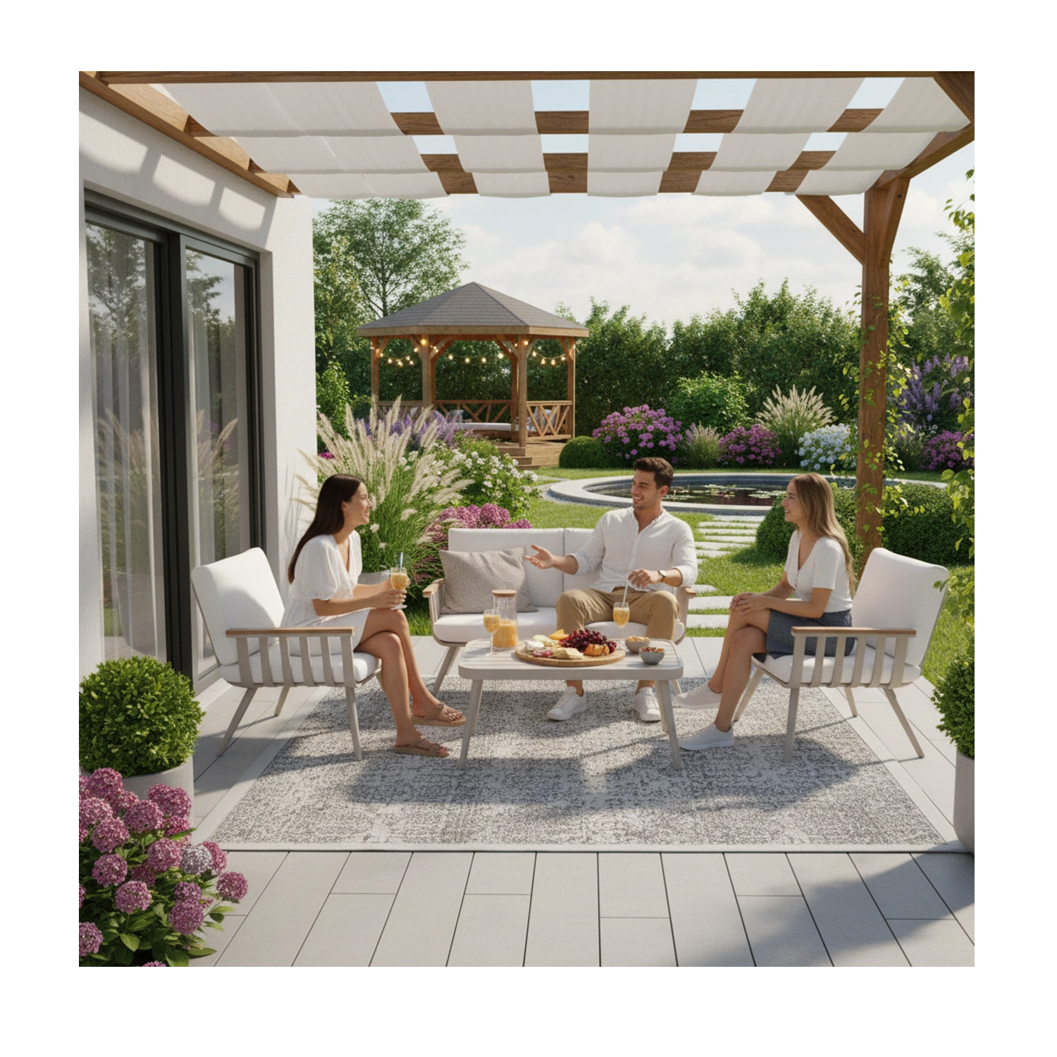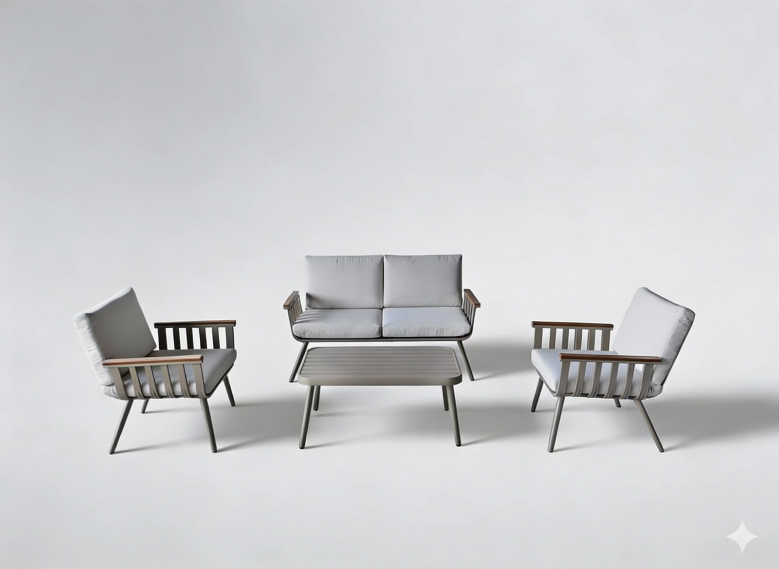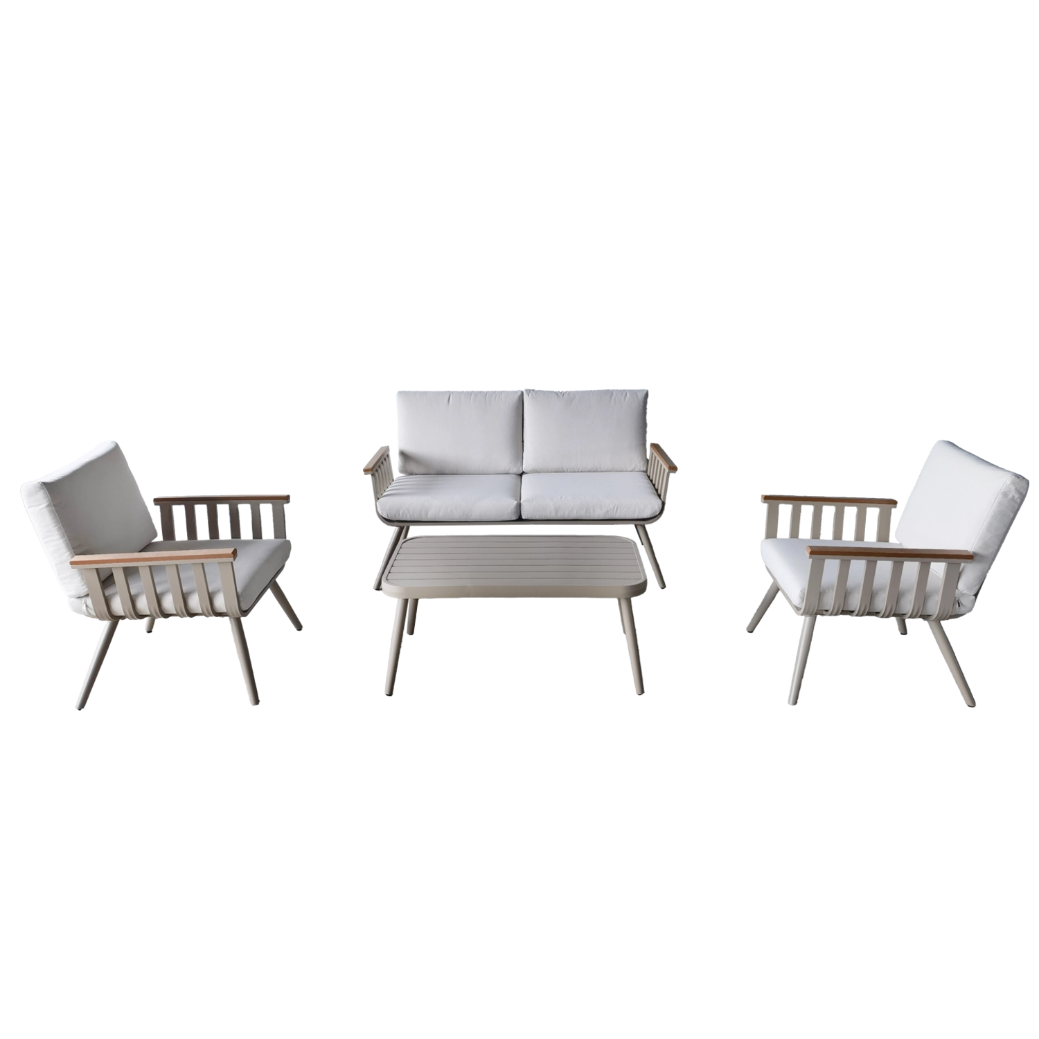 Elegancki i wygodny ogrodowy zestaw dla 4 osób zamieni Twój balkon, taras lub patio w oazę spokoju. Zestaw zawiera sofę dwuosobową, 2 fotele oraz stolik kawowy. Trwała aluminiowa rama, podłokietniki z dekorem drewna oraz miękkie beżowe poduszki zapewniają długą żywotność i komfort. Poszewki z spunpoly 220 g są odporne na promieniowanie UV i wilgoć.