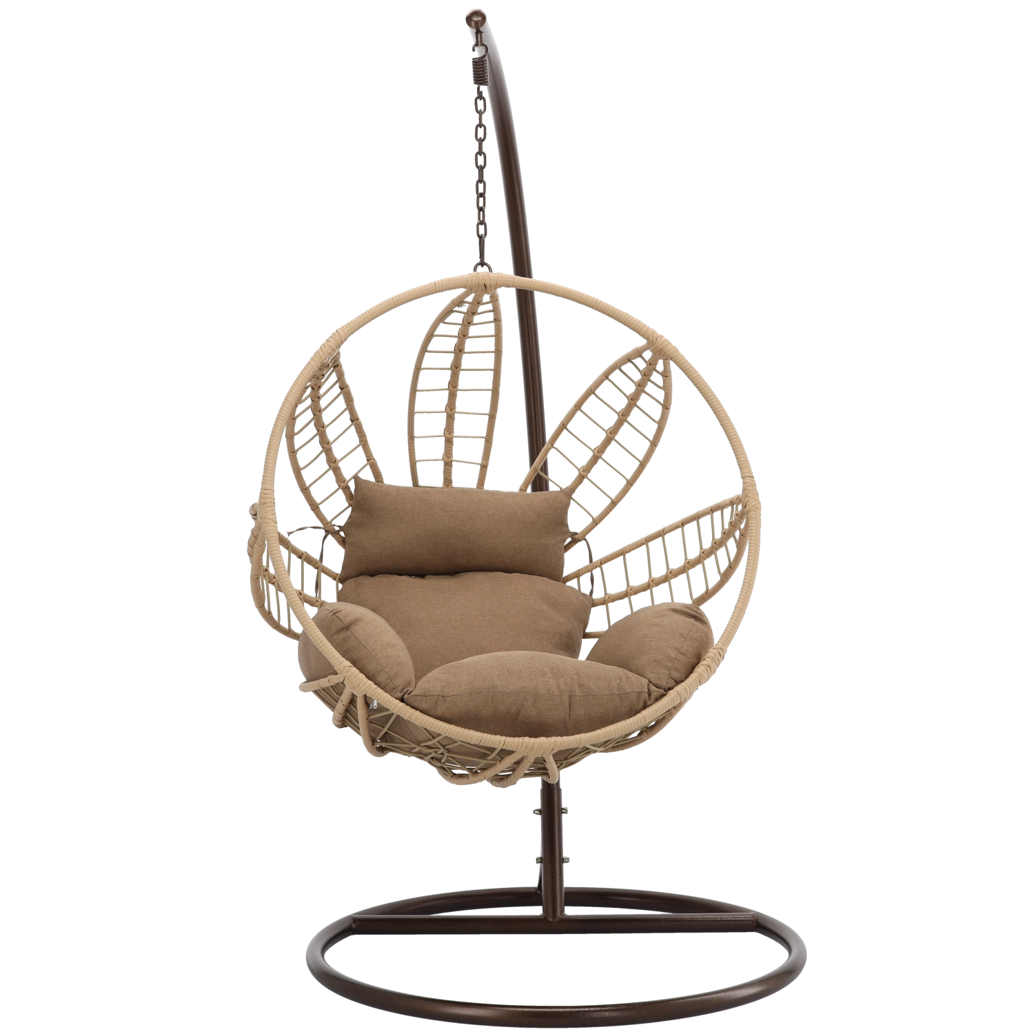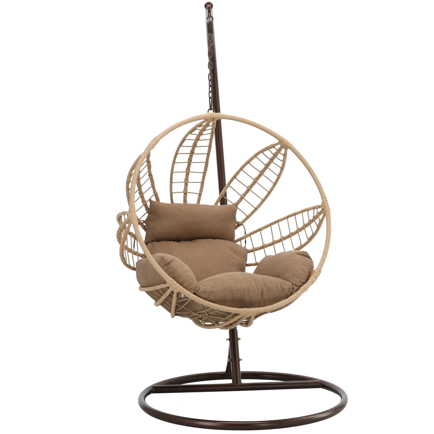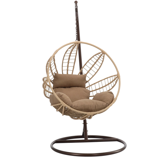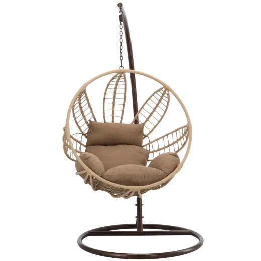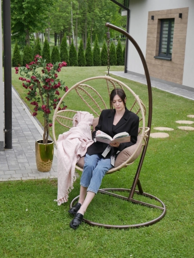 Uprzytulnij taras, balkon lub salon wiszącym fotelem, który łączy nowoczesny, inspirowany naturą design z wysokim komfortem. Przestronny kosz z solidnym splotem i grubą szarą poduszką dosłownie Cię otuli, a stabilna stalowa rama w brązowym odcieniu zapewni spokojne i płynne bujanie.