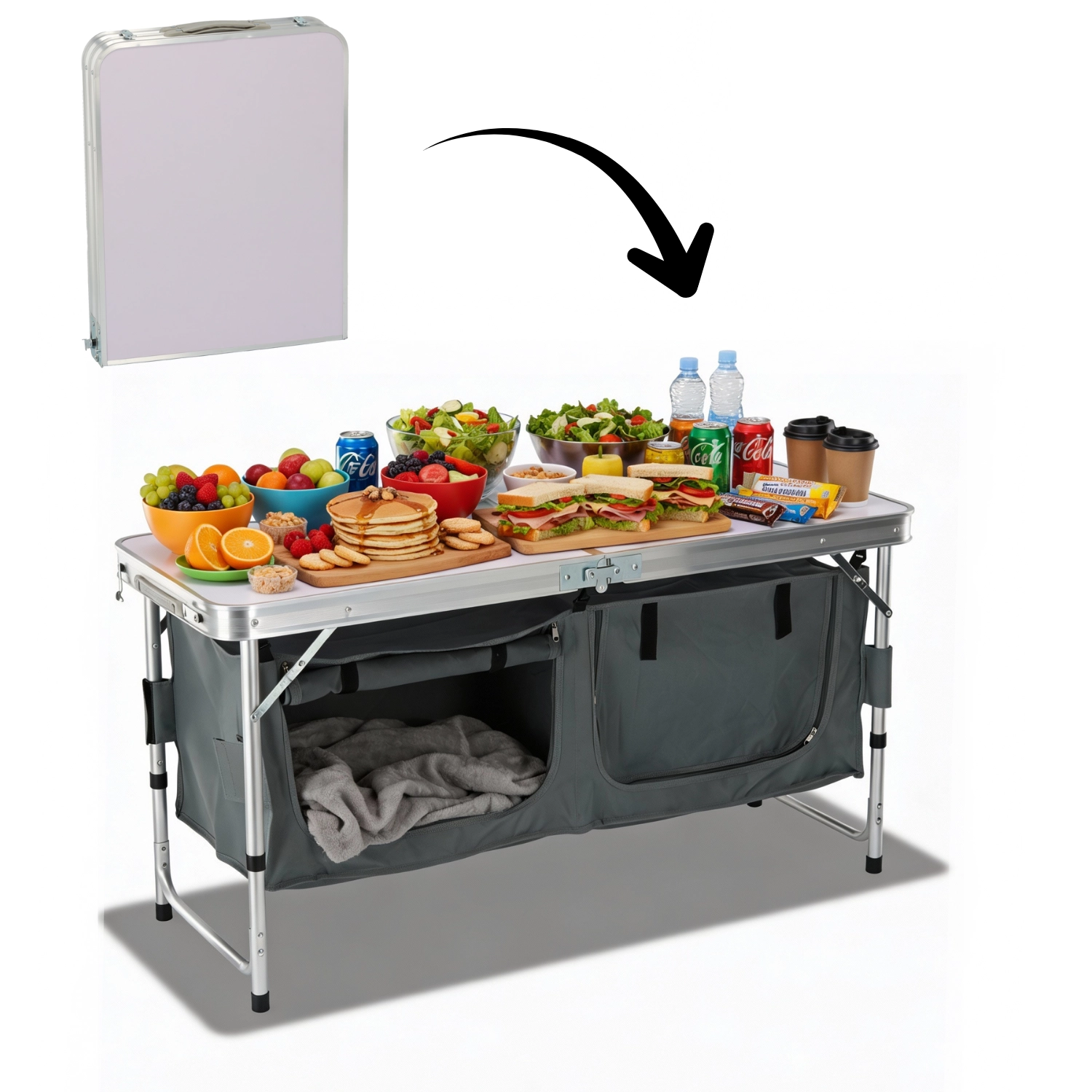 Praktyczna składana kempingowa szafka z solidnym blatem oraz dwiema pojemnymi tekstylnymi szafkami utrzyma idealny porządek w podróży. Dzięki lekkiej konstrukcji z aluminium i blatowi z MDF jest stabilna, wytrzymała i po złożeniu ma kompaktowe wymiary ułatwiające transport.