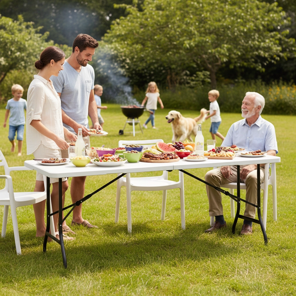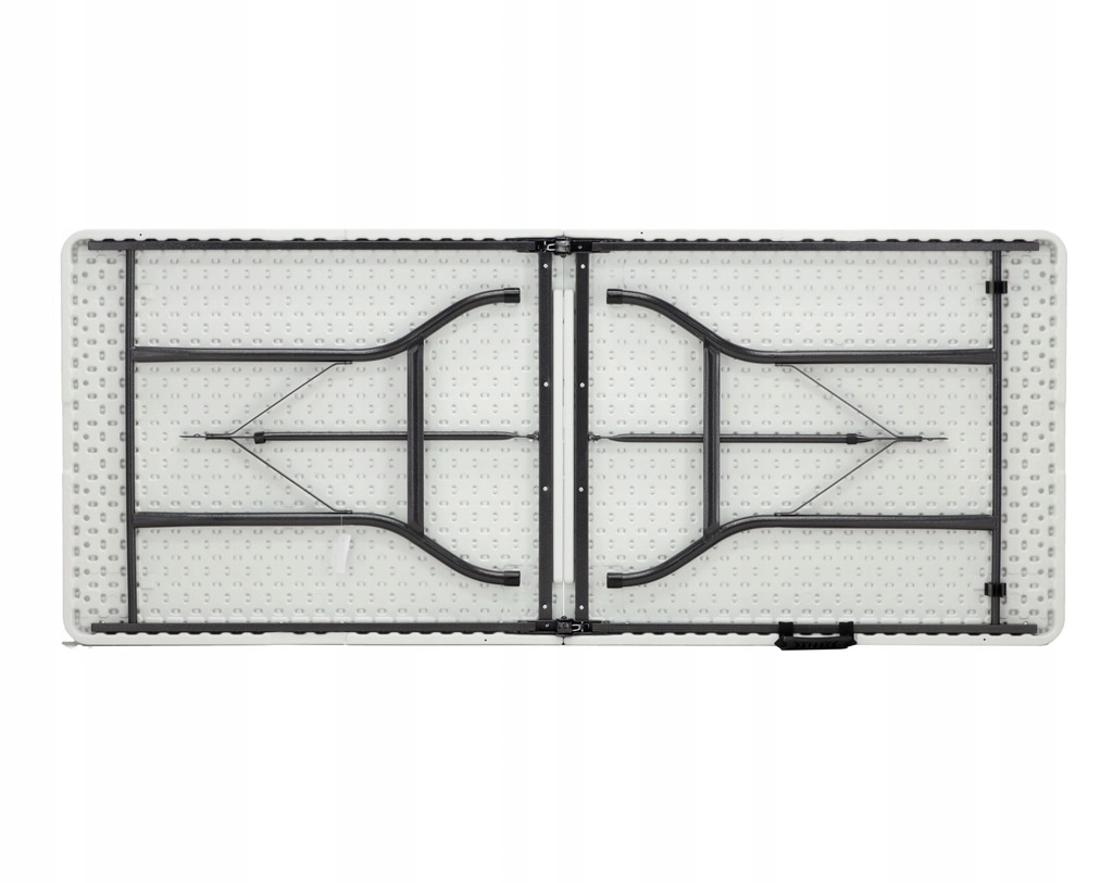 Praktyczny i uniwersalny składany stół na imprezy ogrodowe, catering, kemping i targi. Oferuje dużą powierzchnię roboczą, wygodnie usadzi 6–8 osób, a dzięki stabilnej konstrukcji z blokadą nóg oraz antypoślizgowym zakończeniom jest bezpieczny. Blat z wytrzymałego HDPE jest wodoodporny i łatwy w czyszczeniu, stół szybko się składa i łatwo przenosi.