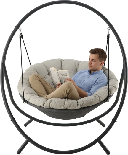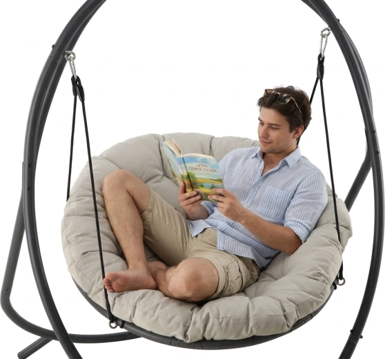 Elegancki wiszący fotel z dużym, okrągłym siedziskiem zamieni każdy balkon, taras lub ogród w strefę relaksu. Grubo wyściełana poduszka w beżowym kolorze i szary metalowy stojak tworzą ponadczasowe połączenie pasujące do stylu nowoczesnego i naturalnego.