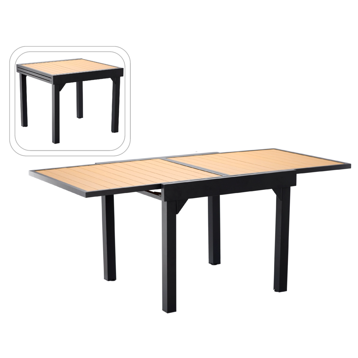 Nowoczesny rozkładany stół ogrodowy z trwałą aluminiową konstrukcją i blatem w dekorze drewna oferuje elastyczną długość 90–180 cm. Dzięki łatwemu rozkładaniu, stabilnej ramie z lakierem proszkowym oraz prostej pielęgnacji jest idealny na taras, balkon i do ogrodu. Maksymalne obciążenie 50 kg.