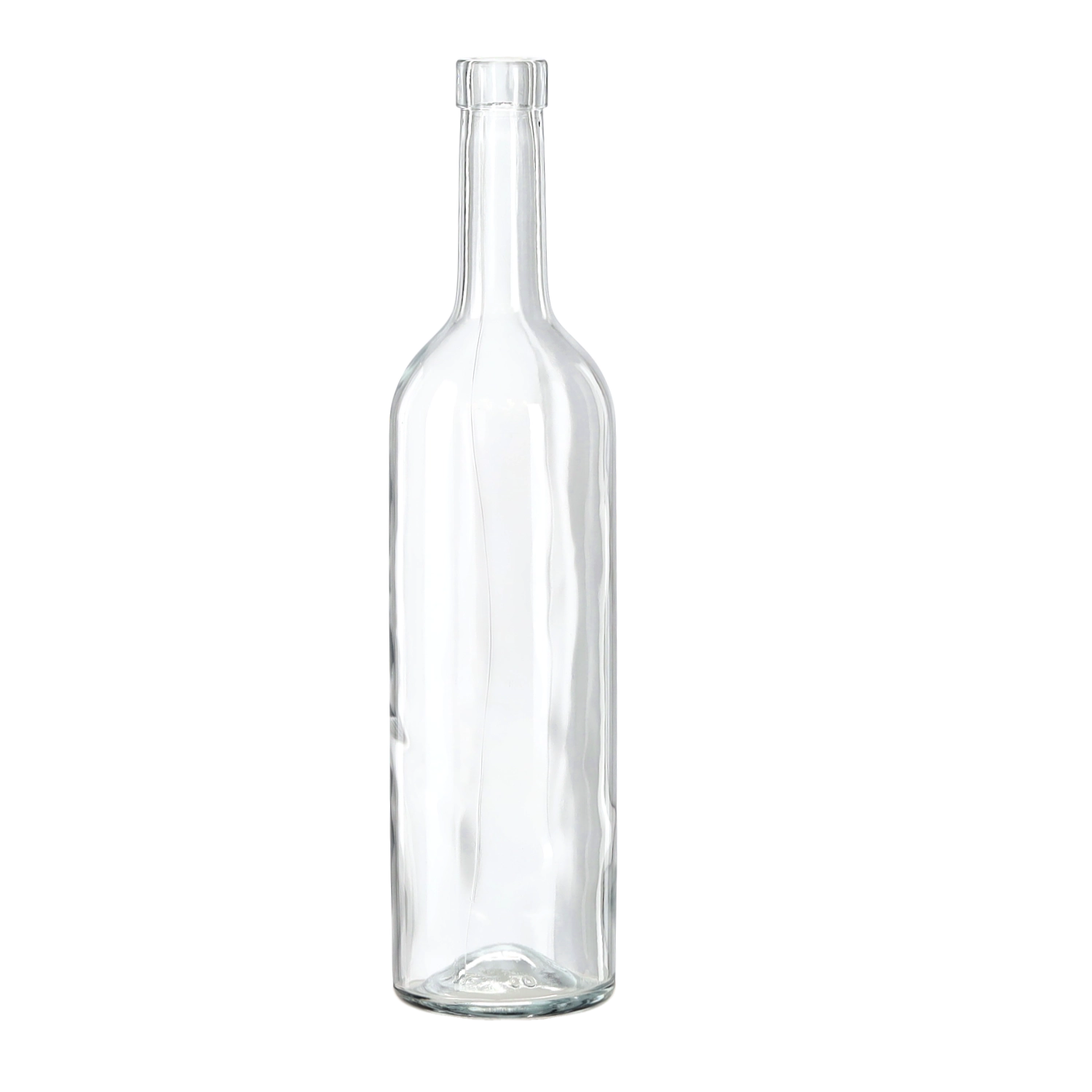 Elegancka, przezroczysta szklana butelka na wino o pojemności 0,75 l w klasycznym kształcie Bordeaux, idealna do domowych win i likierów. Wykonana z wysokiej jakości szkła spełniającego normy higieniczne do kontaktu z alkoholem, co gwarantuje bezpieczne przechowywanie napojów. Dzięki głęboko wklęsłemu dnu (punt) ułatwia dekantację i zatrzymuje osad, a możliwość zamknięcia korkiem zapewnia tradycyjne i niezawodne uszczelnienie.
