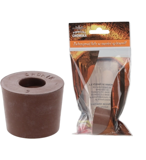Praktyczny i wytrzymały korek gumowy nr 3 jest idealny do domowej produkcji wina i innych napojów fermentowanych. Dzięki swojej elastyczności doskonale dopasowuje się do szyjki gąsiora i zapewnia szczelne zamknięcie. Zintegrowany otwór umożliwia włożenie rurki fermentacyjnej, co gwarantuje bezpieczne ujście gazów podczas fermentacji bez ryzyka kontaminacji. Materiał jest chemicznie obojętny, więc nie wpływa na smak ani zapach napoju.