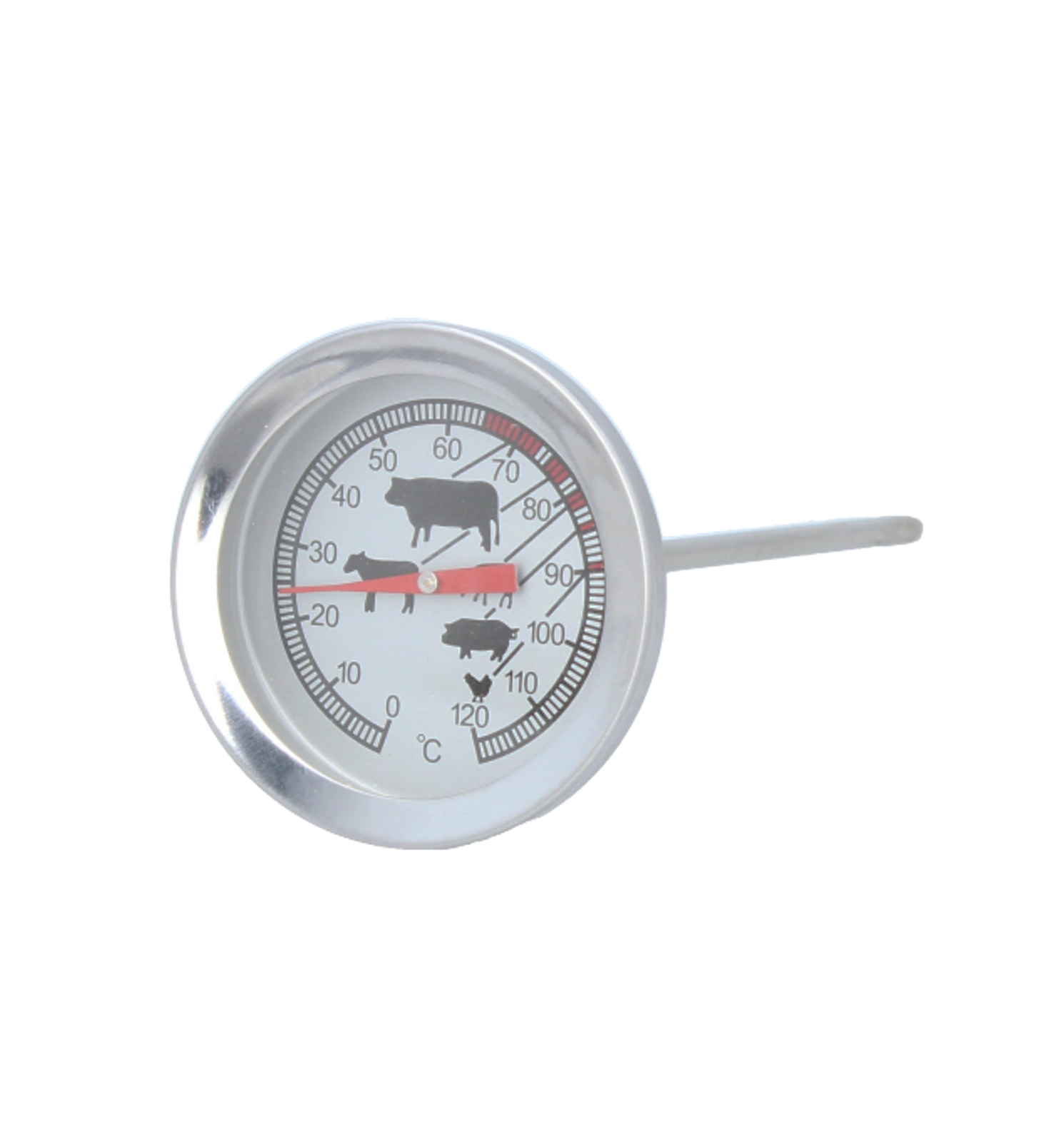 Osiągaj konsekwentnie świetne wyniki podczas pieczenia i grillowania. Ten termometr do mięsa z wysokiej jakości stali nierdzewnej oferuje szybkie i precyzyjne odczyty temperatury w zakresie 0–120 °C. Wystarczy wbić go w najgrubszą część mięsa, omijając kości, i na bieżąco kontrolować temperaturę. Dzięki przejrzystemu cyferblatowi z ikonami dla różnych rodzajów mięsa łatwo rozpoznasz, kiedy potrawa jest gotowa.