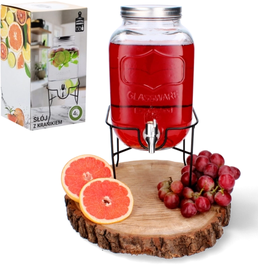 Ten szklany dyspenser do napojów łączy funkcjonalność z designem. Pojemność 4 l wystarczy na rodzinne uroczystości i większe spotkania, a metalowa pokrywka chroni napój przed zanieczyszczeniami i owadami. Płynne dozowanie zapewnia praktyczny kranik, dzięki czemu unikasz rozlewania i bałaganu na stole.