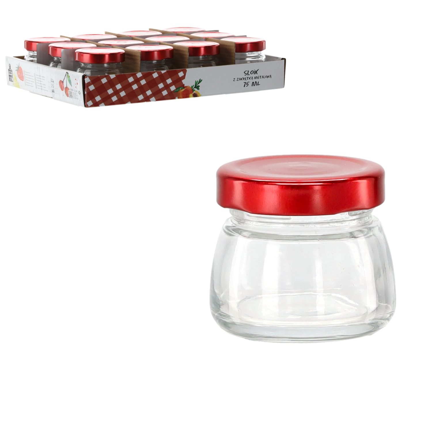 Ten elegancki słoik o pojemności 75 ml wykonany jest z wysokiej jakości, przezroczystego szkła, które podkreśla kolor i strukturę przechowywanych produktów. Czerwona metalowa zakrętka zapewnia niezawodne zamknięcie i pomaga zachować świeżość, aromat i smak Twoich domowych wyrobów.