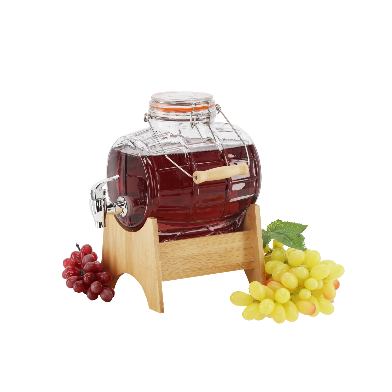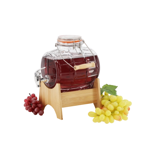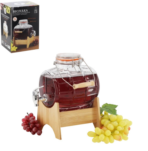 Stylowa szklana beczułka o pojemności 3 litry jest idealna do serwowania wina, piwa, soków i lemoniad. Oferuje wytrzymałe grube szkło, praktyczny plastikowy kranik do płynnego nalewania oraz mechaniczne zamknięcie z gumową uszczelką dla perfekcyjnej szczelności. W zestawie znajduje się elegancki bambusowy stojak, który zapewnia stabilność i wygodne użytkowanie w domu, na przyjęciach i weselach.