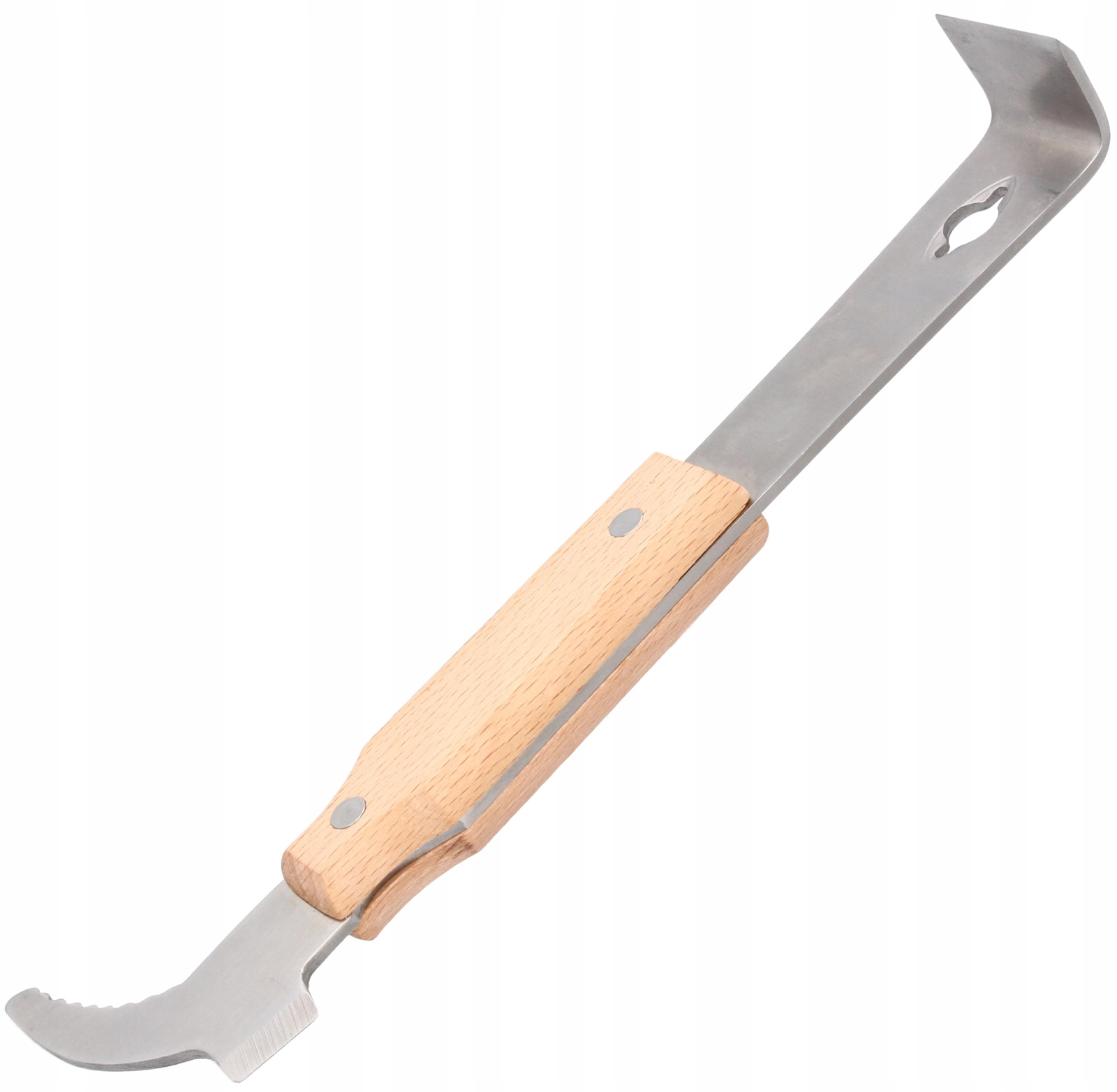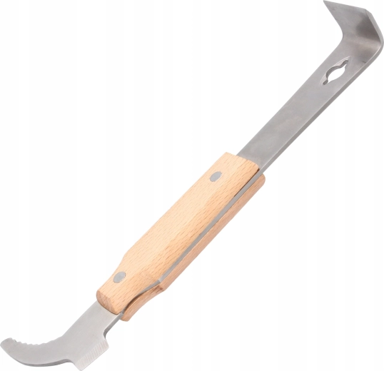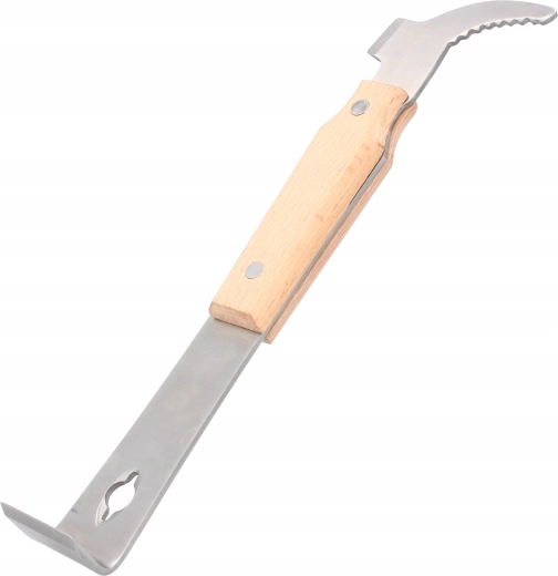 Ergonomiczna drewniana rękojeść zapewnia pewność i komfort także w rękawicach, idealna do pracy przy ulu w terenie.