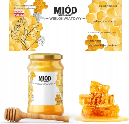- Jasne określenie rodzaju miodu – etykiety do miodu wielokwiatowego dla łatwej identyfikacji.